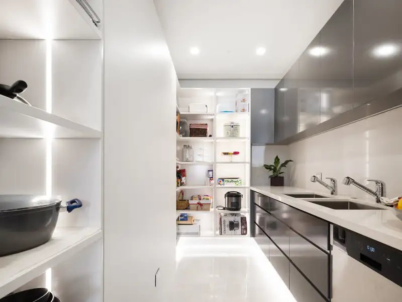 - Butlers pantry includes walk-in sensor light, plenty of shelving/storage space, double Franke stainless sink, insinkerator, and twin adjustable head tapware