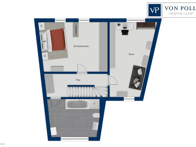 A solid wooden staircase leads to the upper floor. Two flexible rooms are available here, which are ideal for use as bedrooms, children's rooms or studies. The bright and very spacious daylight bathroom ensures a pleasant start to the day.