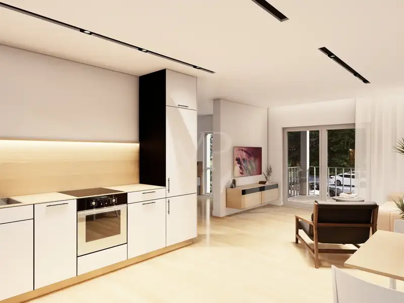 The heart of the apartment is the spacious, light-flooded living and dining area, which creates space for relaxing hours outdoors thanks to direct access to the balcony. Large windows provide a pleasant daylight atmosphere and an open feeling of space.