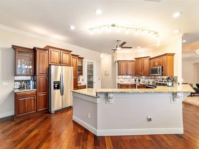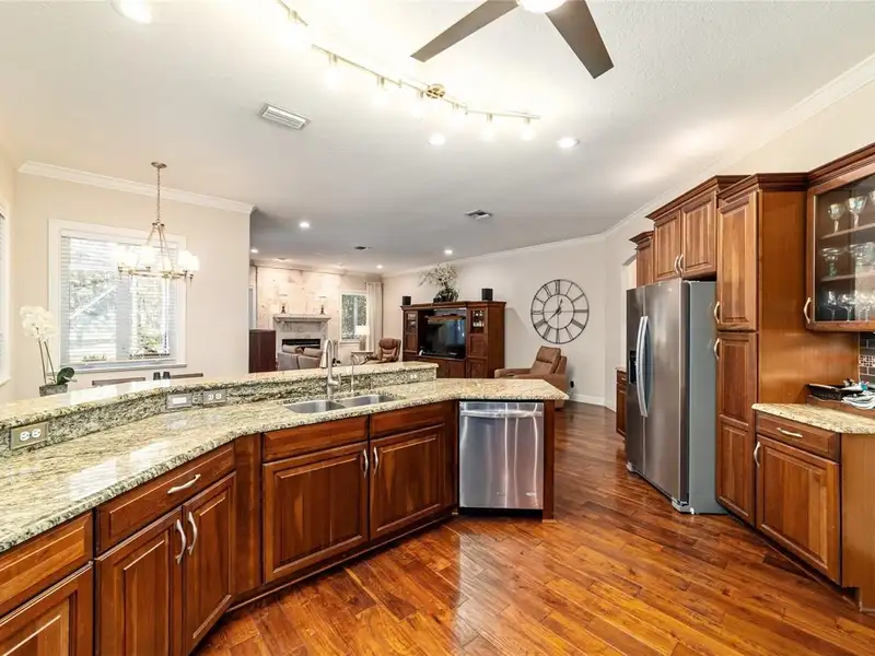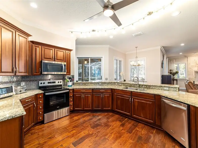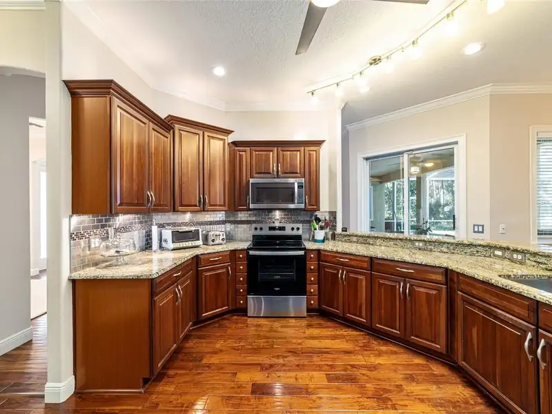 - Granite kitchen countertops and wood cabinets