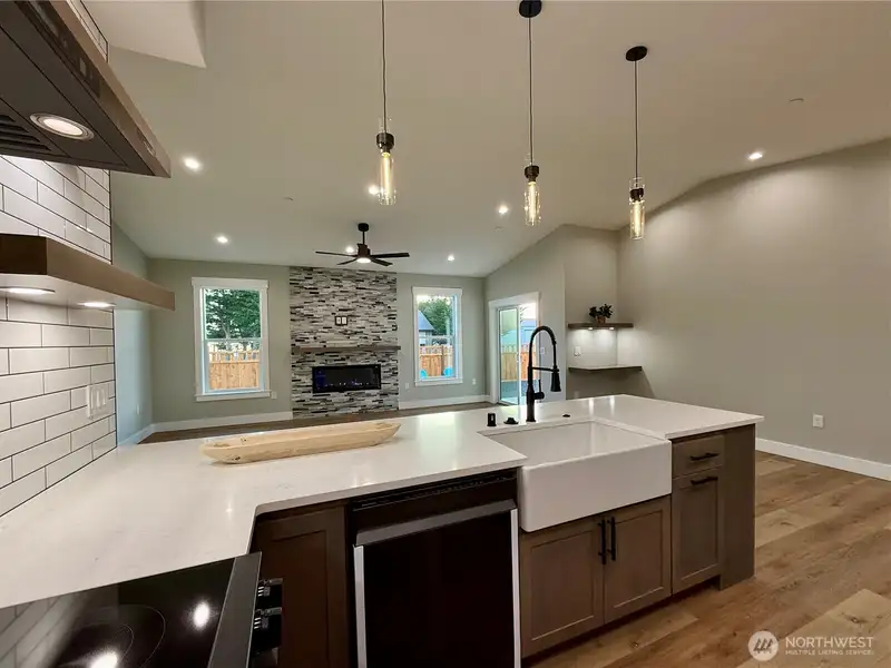 - Vaulted ceilings and stone fireplace