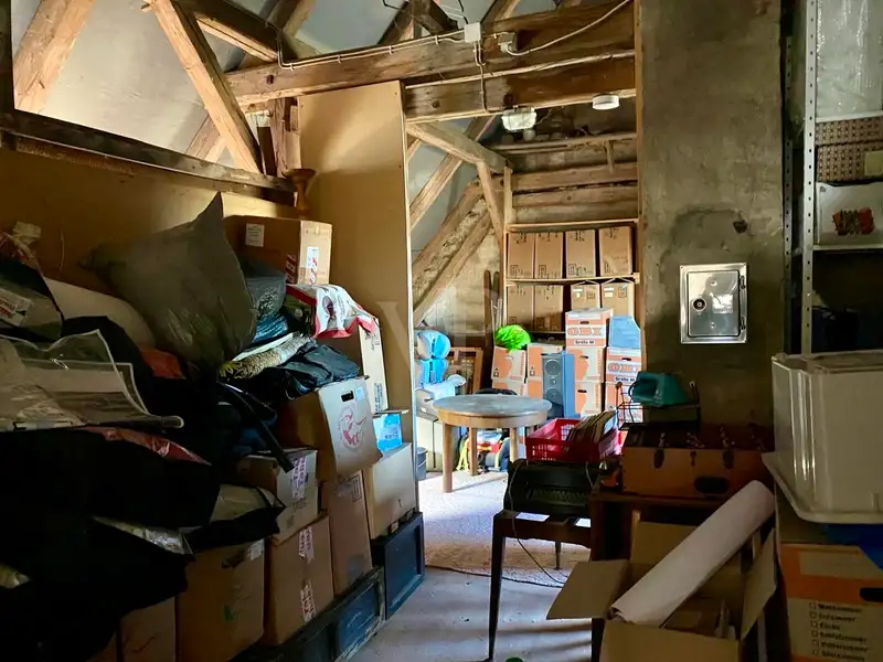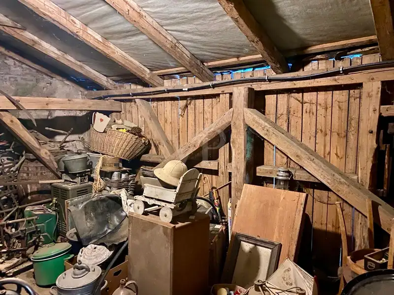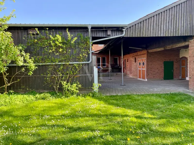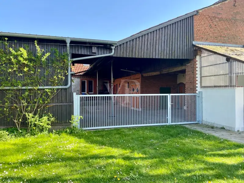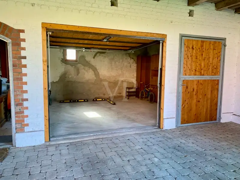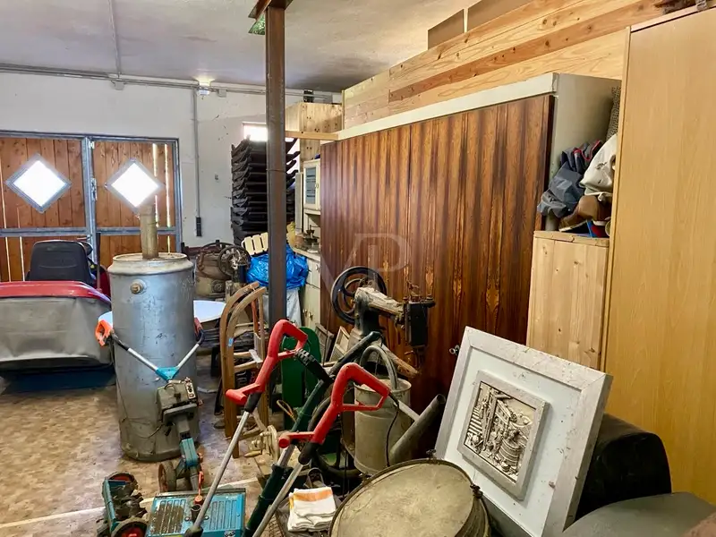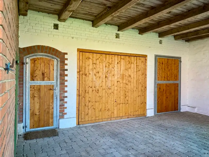 The former stable area has new doors and gates. It would be possible to build 2-3 horse boxes in this part. A wooden shed is also available as a garage or further storage space.