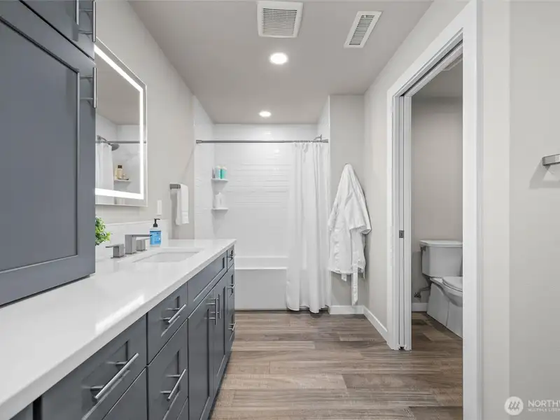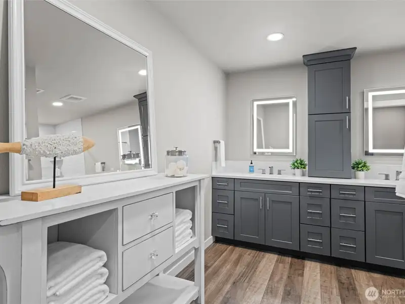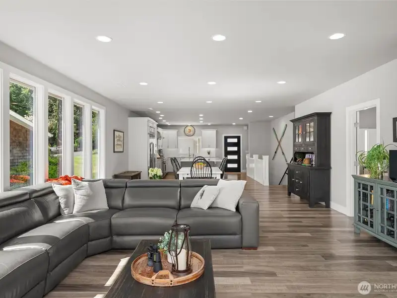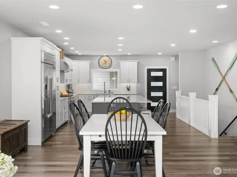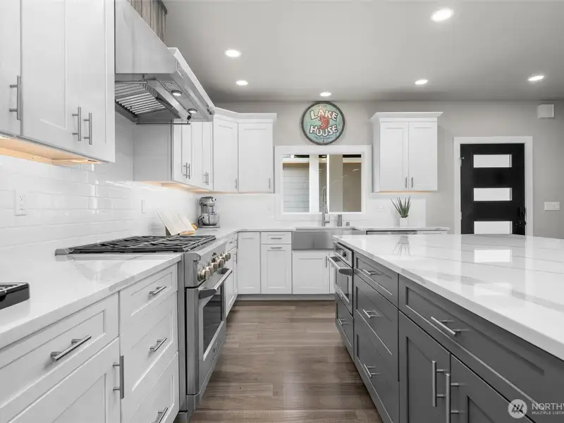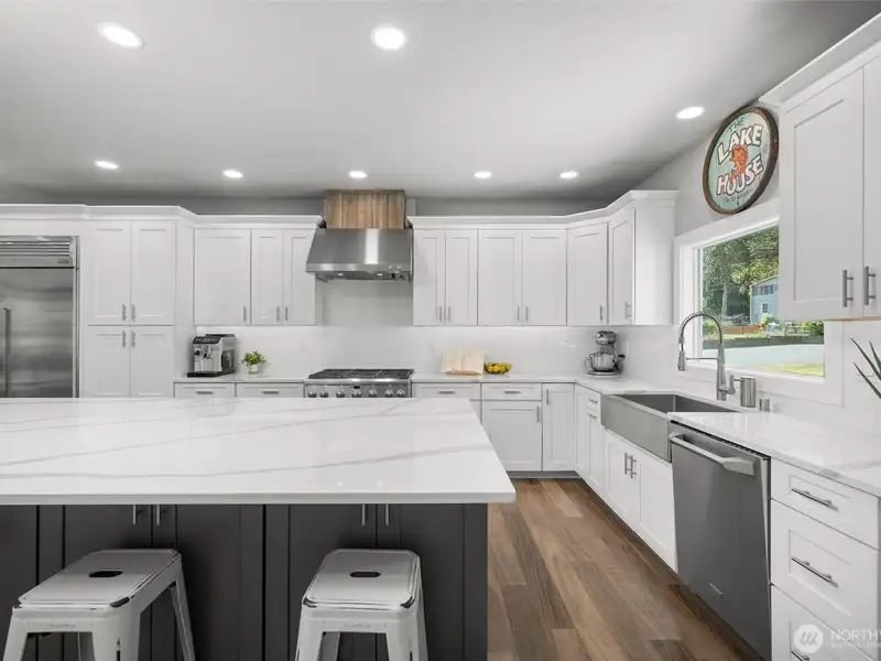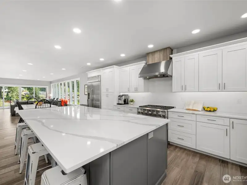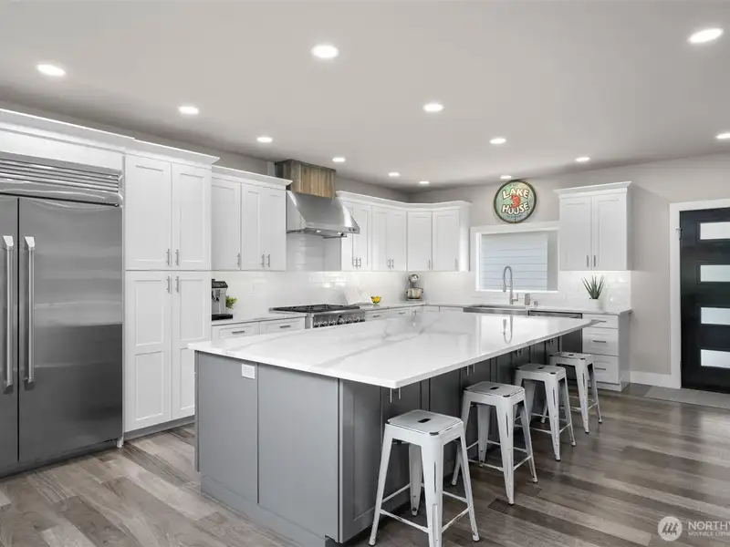 - Oversized quartz island with eating bar