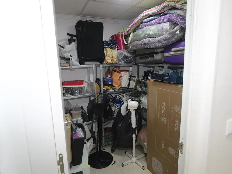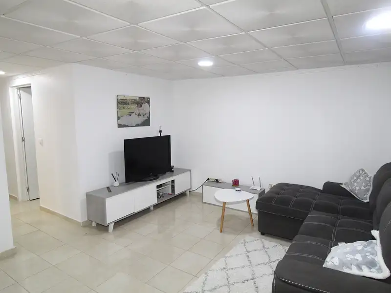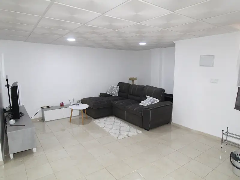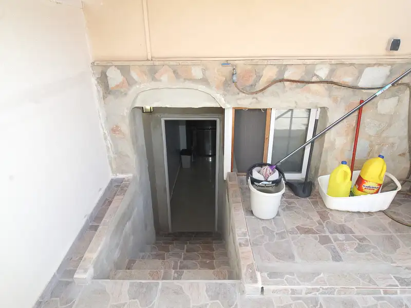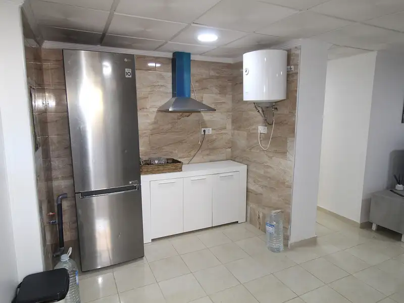 Inside the apartment on the ground floor, you have the primary living room and equipped open-plan kitchen with a separate laundry room, two bedrooms both with fitted wardrobes and a bathroom with a walk-in shower. Downstairs in the basement level, you have another kitchen and a sizable living area, a storage room, a bathroom with a walk-in shower, and another double bedroom.