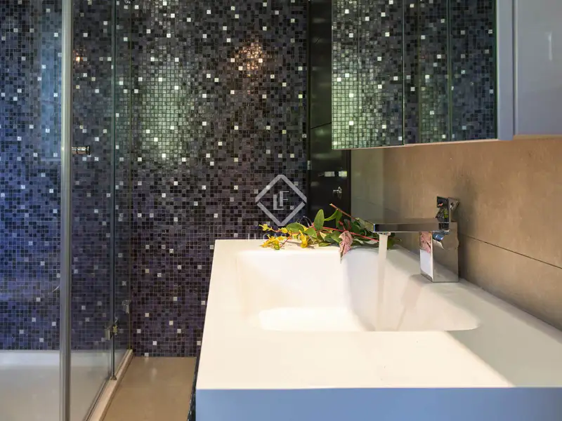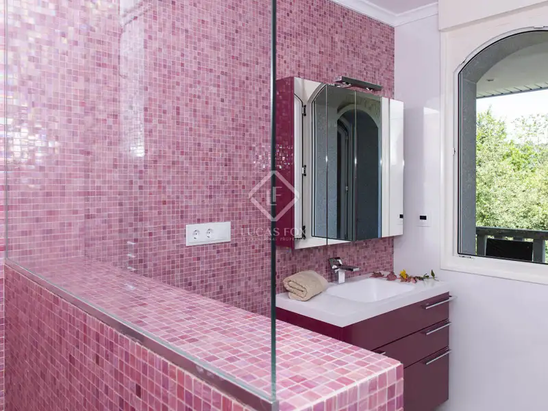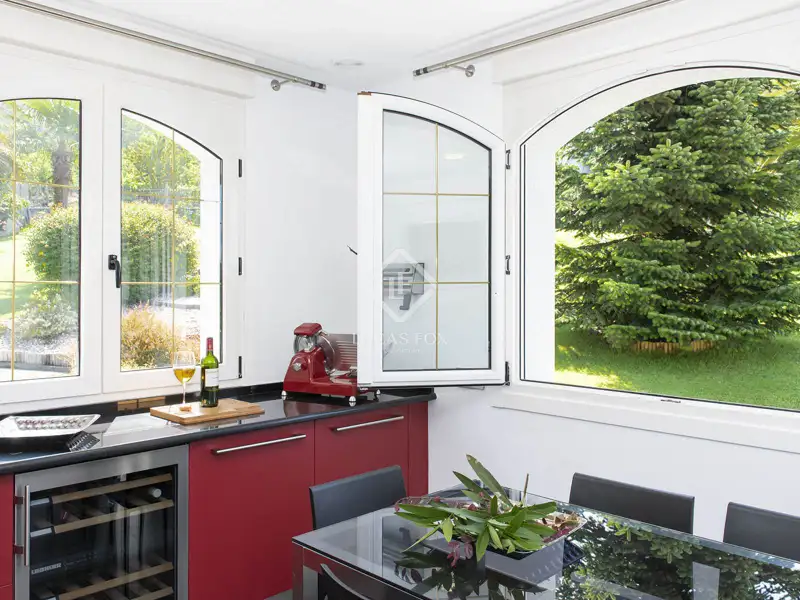 The built-in swimming pool is totally integrated into the house and has direct access from all the rooms and at the same level. It offers a changing area and bathroom.