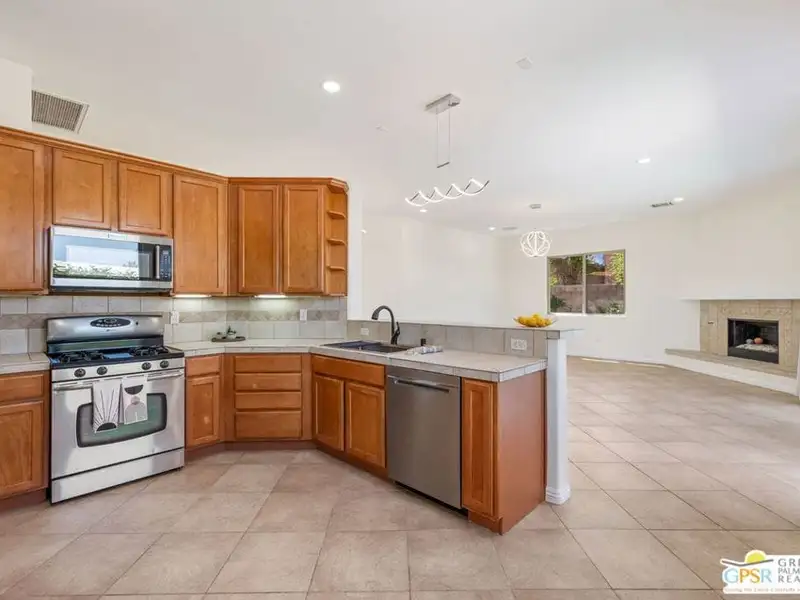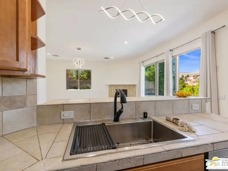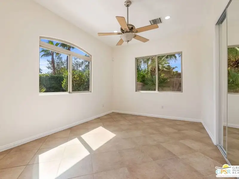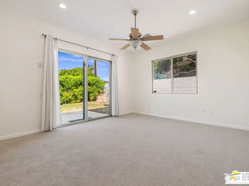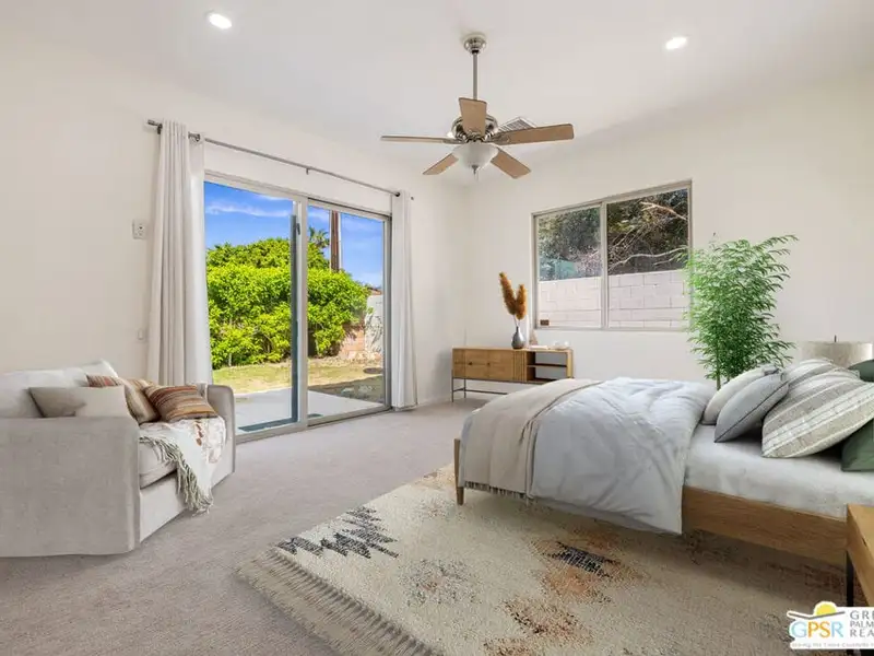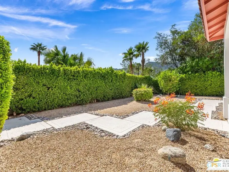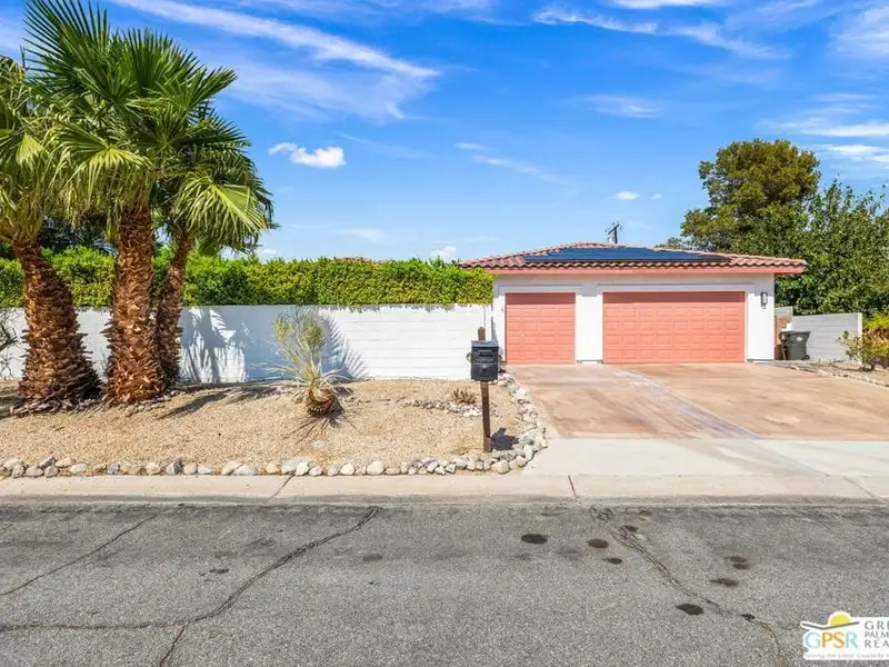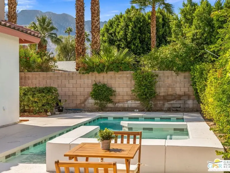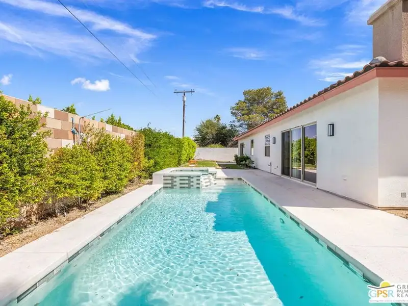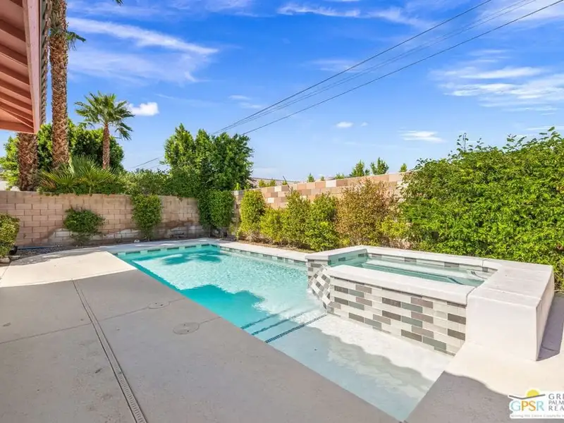 Contemporary open-concept Palm Springs pool home showcasing rare 2003 construction in Desert Park Estates. This exceptionally light filled and private residence with 8-foot doors and soaring 10-foot ceilings throughout is a beautiful example of Palm Springs living: stylish, comfortable, and inviting.The property is fully walled for privacy, and once you step through the front gate, you're transported to your own private oasis. The large front courtyard and backyard pool and spa area with newly tiled surfaces, offer multiple spaces for lounging, relaxing, and entertaining, all complemented by a freshly painted exterior. Redesigned desert landscaping provides water efficiency while maintaining a sizable patch of grass for greenery and enjoyment. A tall privacy hedge at the front creates an additional courtyard living area that's ideal for outdoor entertaining.At the heart of the home, the expansive great room features a beautiful fireplace, soaring ceilings, and a triple panel of glass sliders that open to the pool and raised spa. The open-concept layout includes distinct, well-planned living, dining, and kitchen areas, with the kitchen offering tiled counters, a breakfast bar, and a large pantry.Inside, the home is light and bright, enhanced by fresh interior paint that highlights the open design and generous natural light throughout. The spacious primary suite features a beautifully appointed bathroom with dual sinks, a step-in tiled shower, a stand-alone soaking tub, and a walk-in closet with a large picture window framing views of the lush backyard. A second patio off the primary suite provides a private lawn area perfect for pets. The suite is joined by a guest bedroom, a third bedroom, and a newly constructed fourth bedroom ideal for an office or den.Additional highlights include 2.5 bathrooms, a separate laundry room, and an attached air-conditioned three-car garage with a split unit. Your energy costs are kept low with 14 owned and 34 leased solar panels at $203 per month. Thoughtfully oriented to capture mountain views, this home offers ideal spaces for both sun and shade. A truly happy and comfortable residence designed for serenity, privacy, and effortless Palm Springs living. Your desert oasis awaits!