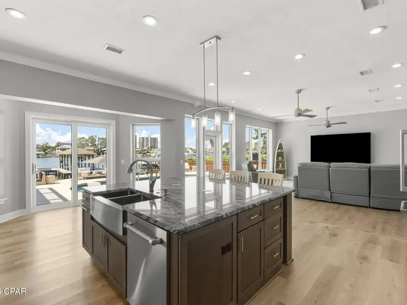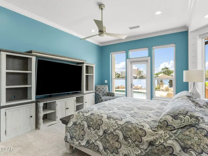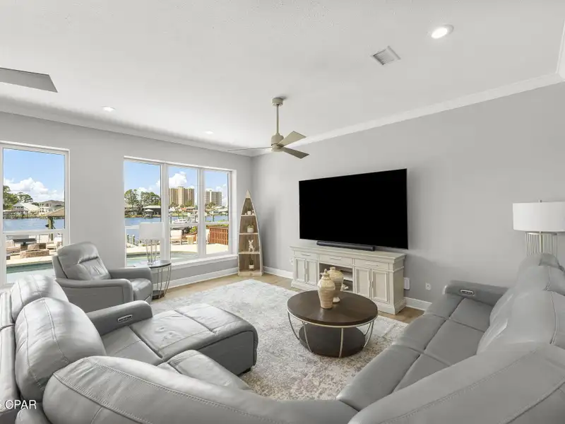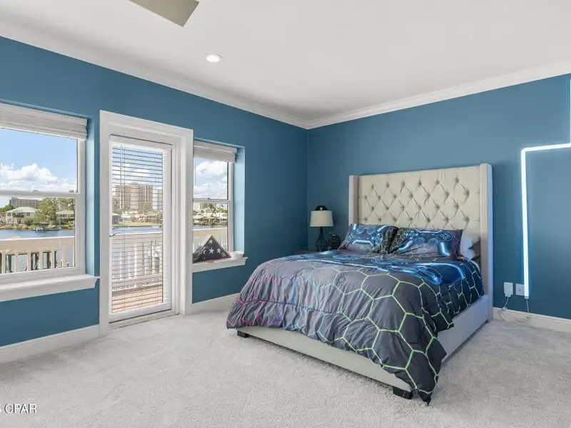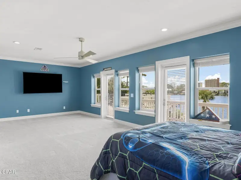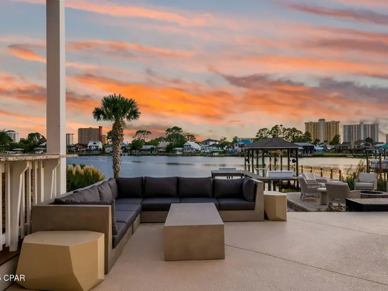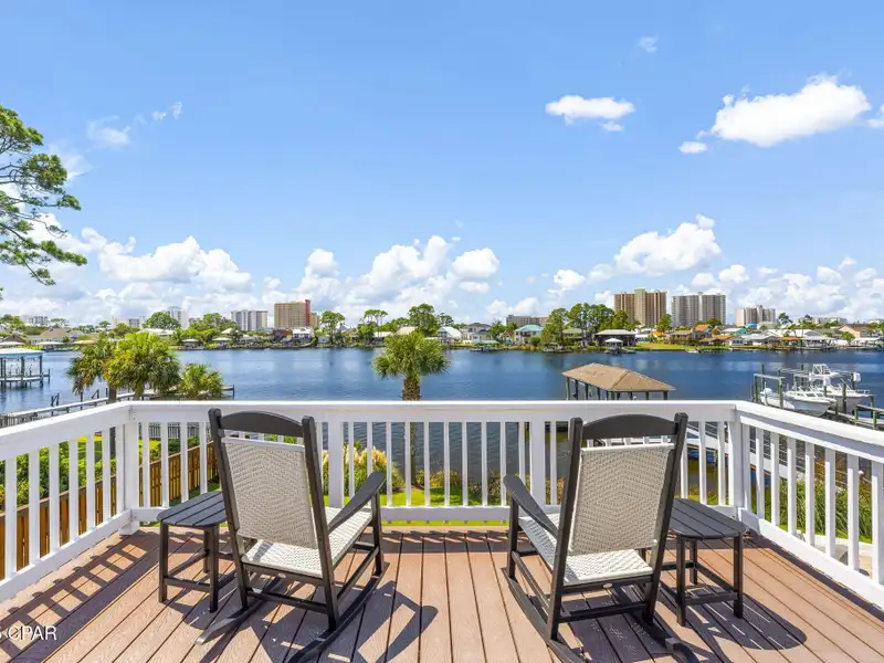 - Covered deck and rear balcony with water views