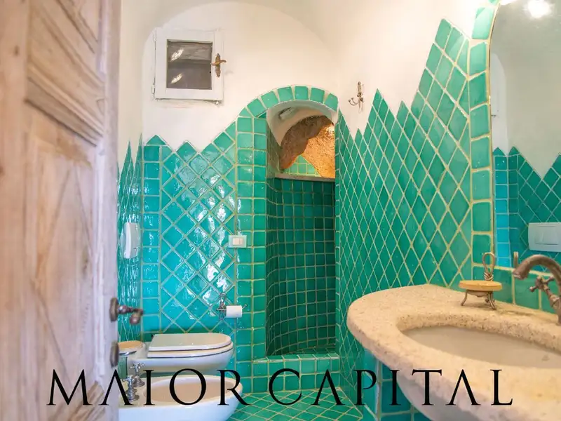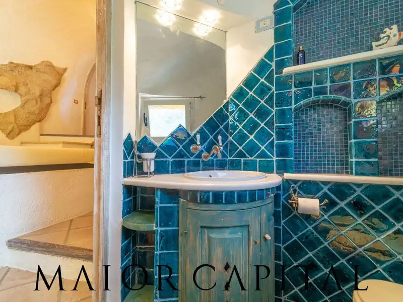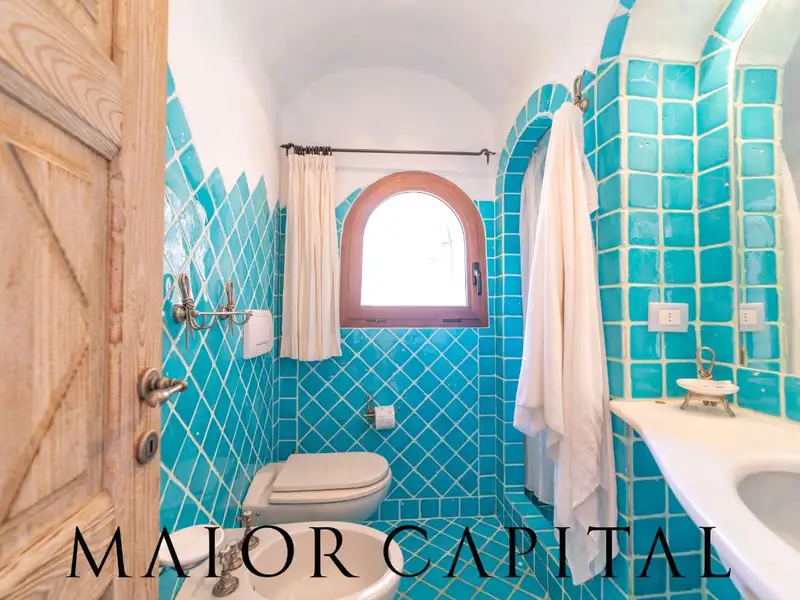 The master suite, spacious and bright, opens onto nature with exclusive views and an en suite bathroom decorated with fine Cera Sarda tiles in shades of blue, light blue and brown, evoking the Mediterranean. The other double rooms, refined and quiet, maintain the same distinctive style and constant connection with the outdoors. Each space is designed to offer comfort, privacy and beauty.