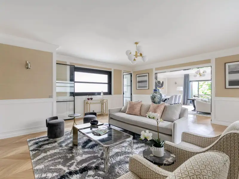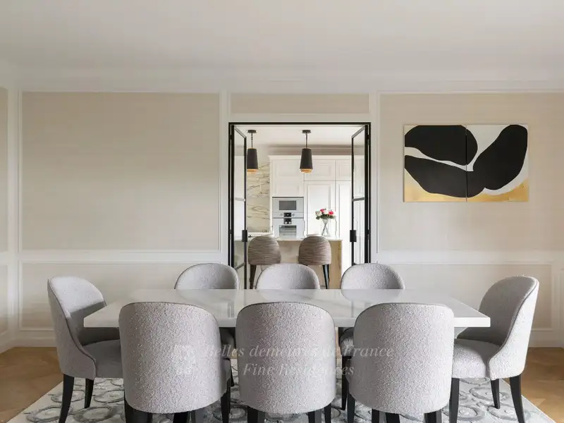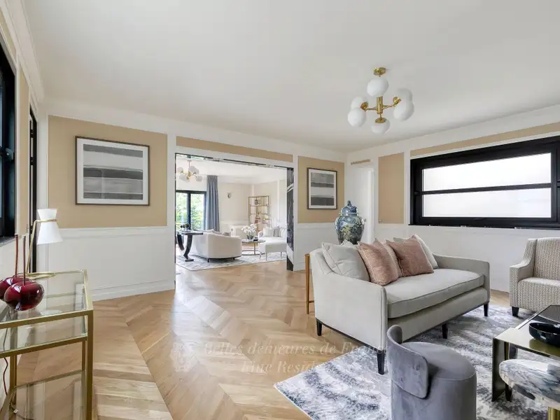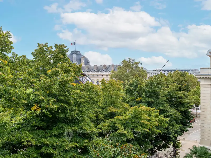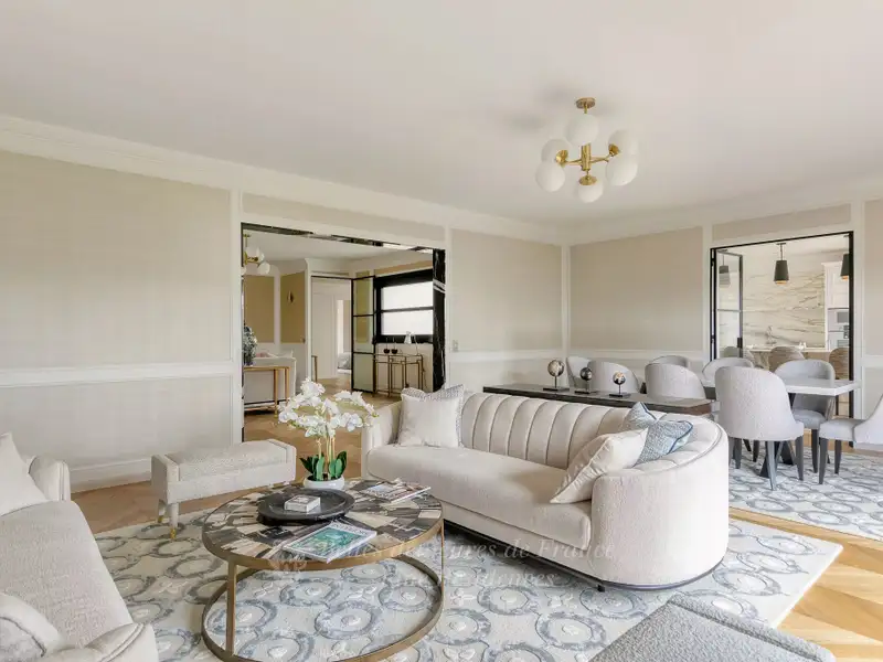 This entirely renovated 260 sqm dual-aspect apartment bathed in sunshine is on the 3rd floor of a magnificent Art Deco building with superb common areas located on the edge of the Champ de Mars. Commanding exceptional views of the Eiffel Tower, it includes a double living/reception room opening onto two balconies, a dining room, a drawing room or study, a kitchen, a utility room, a master suite with a bathroom and dressing room, three further bedrooms and a bathroom. Four cellars and a parking space in the building. An exceptional family apartment near the shops and the schools. Possibility to buy, on top of that price, a 26 sqm studio apartment in that same building.