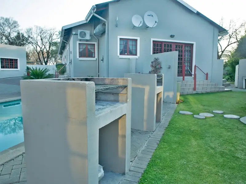 Relax and unwind by the sparkling swimming pool or entertain guests in the inviting braai area and patio, surrounded by a lush garden setting.