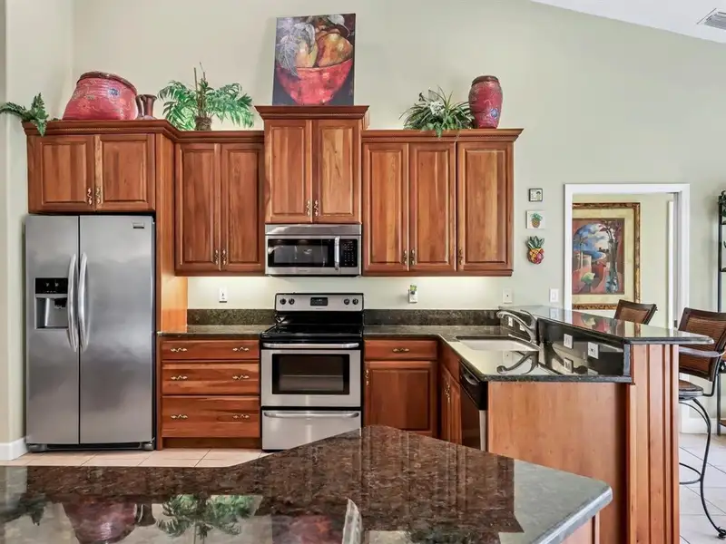 - Updated kitchen with granite counters and wood cabinetry