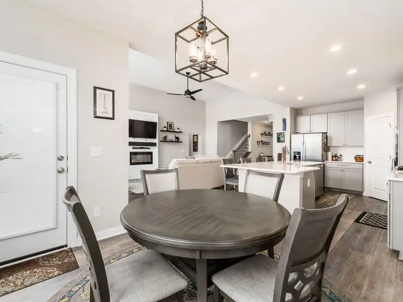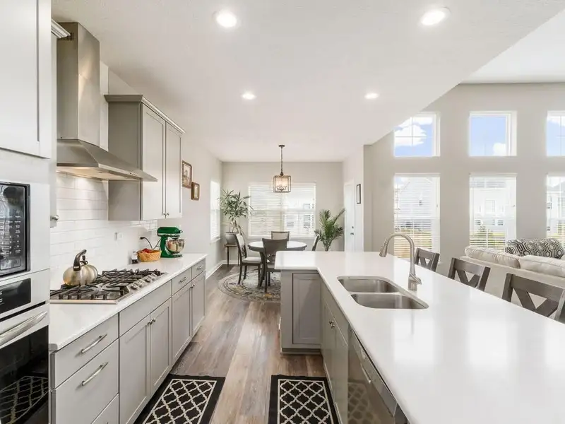 - Open floor plan with large kitchen island