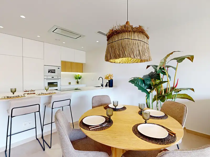 The apartments for sale in Pilar de la Horadada and duplexes feature a refined Mediterranean design, blending bright, airy interiors with stylish contemporary finishes. The properties include three spacious bedrooms and two bathrooms, with ground-floor apartments offering large private gardens and top-floor duplexes featuring expansive terraces and private solariums. Solariums come equipped with a summer kitchen, outdoor shower, and storage. The fully fitted kitchens are designed with high-end appliances such as ceramic hobs, extractor hoods, dishwashers, ovens, microwaves, refrigerators, and washing machines. The homes also come with pre-installed air conditioning, aerothermal systems for hot water and heating, and TV/SAT/TEL connections, ensuring maximum comfort throughout the year.