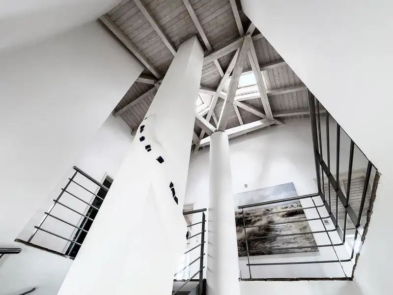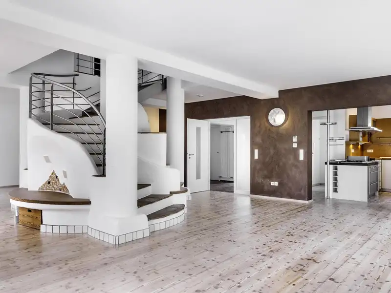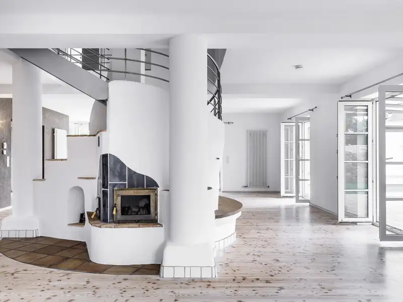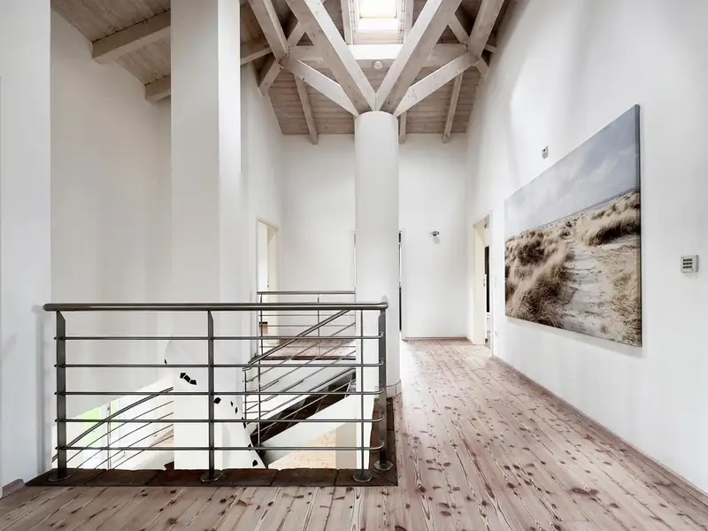 The heart of the property is undoubtedly the open-plan living, cooking and dining area as the communicative center of the house. More than 80 m² of pure space, flooded with natural light thanks to numerous floor-to-ceiling windows. An ornate brick-built stove provides cozy warmth, which extends through the open gallery to the upper floor.