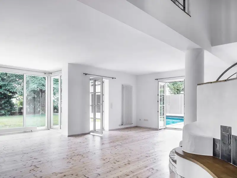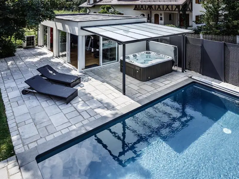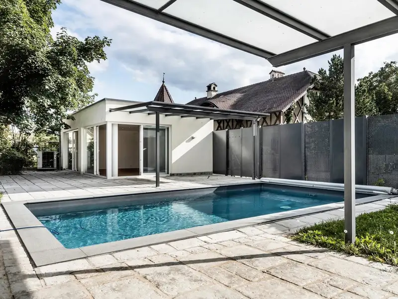 The 8 x 4 m heated pool blends harmoniously into the garden design - a place for relaxation, sport and joie de vivre. The ensemble is framed by high-quality natural stone terraces that offer a variety of uses - whether sun loungers, lounging or dining in the open air.