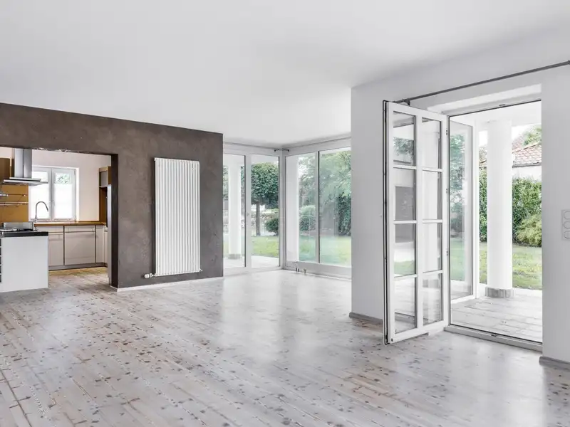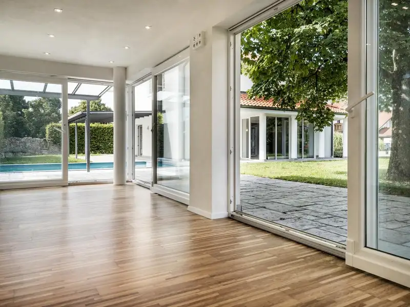 The stylish bay window in the dining room opens up a picturesque view of the garden - a special treat at any time of year. From here you have direct access to the spacious south and west-facing terraces. The south-facing terrace in particular, with its modern glass and steel roofing, invites you to enjoy unforgettable summer evenings - outdoor living at the highest level.