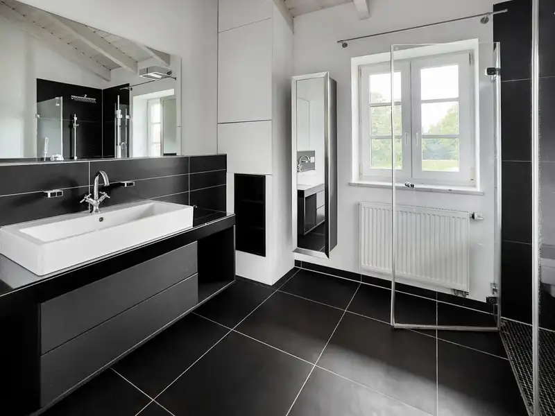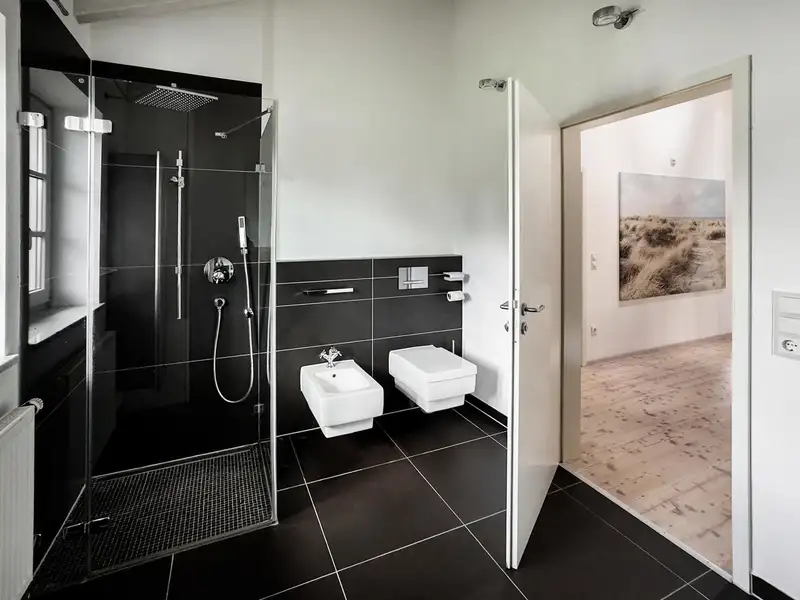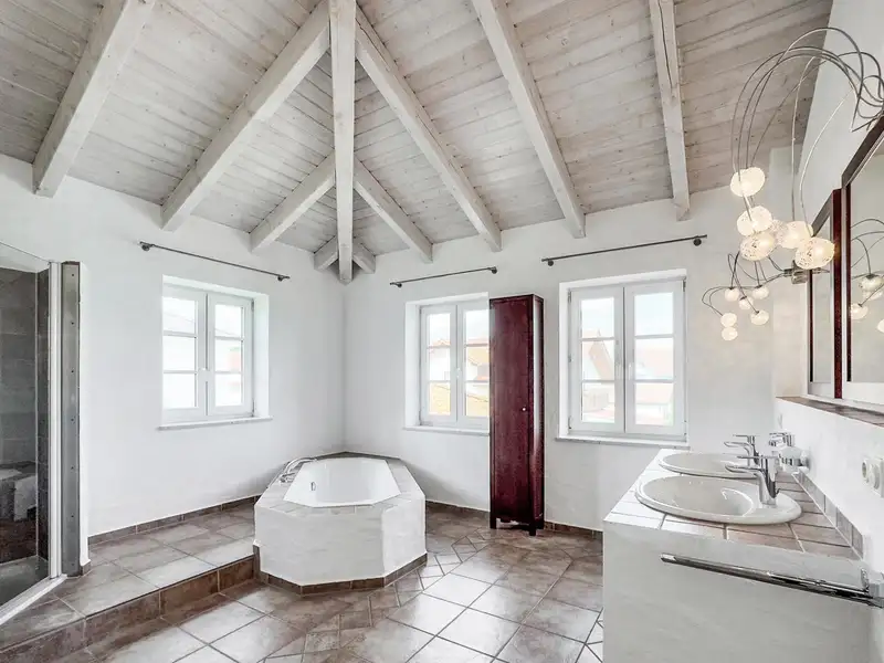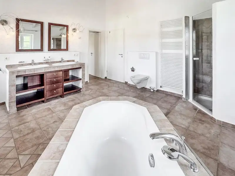 - Free-standing bath, floor-level shower, two washbasins and separate WC