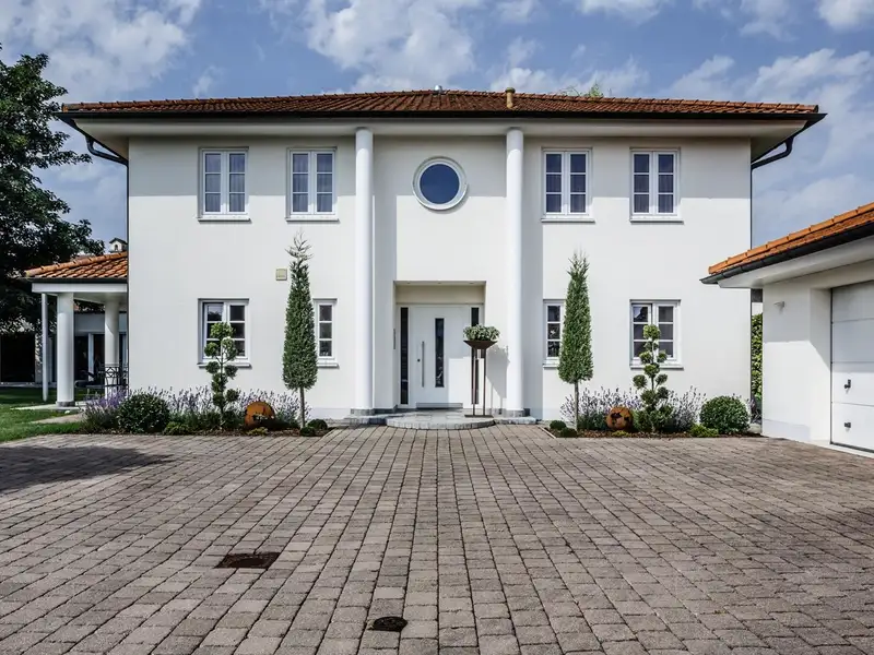 Even at first glance, the villa impresses with its harmonious, Tuscan-inspired design: Two full storeys under an elegant tent roof lend the house presence and timeless beauty. The classic façade design is complemented by natural stone terraces and a spacious driveway - here you can reside in style.