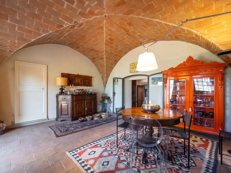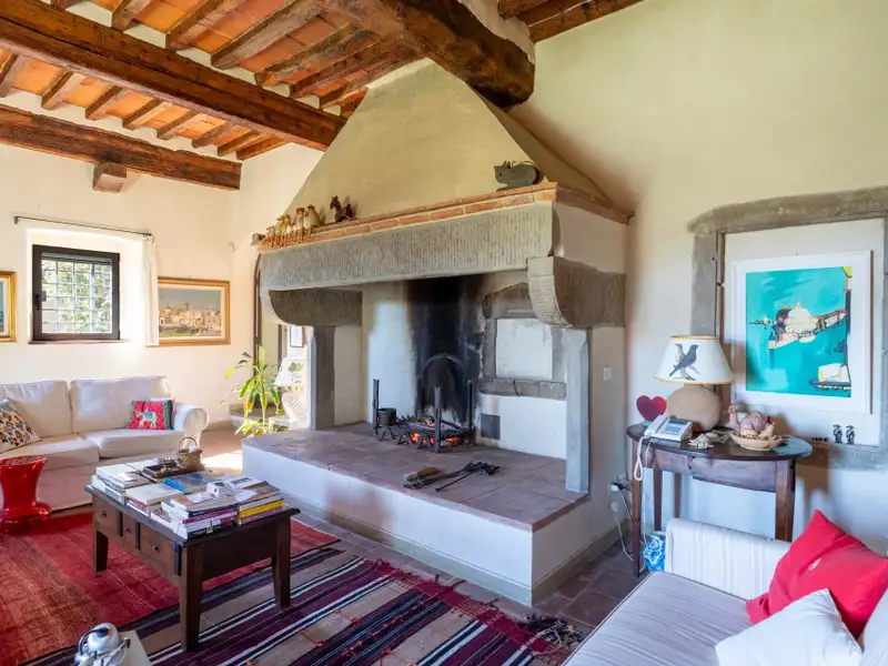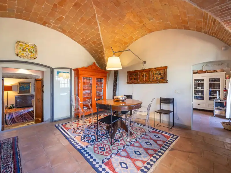 It originated as a tower house in the 12th century. Subsequent enlargements resulted in the “scapicozzatura” of the tower, and before being used as a farmhouse, it was used for religious purposes, as specific finishes, in the present living room, suggest.