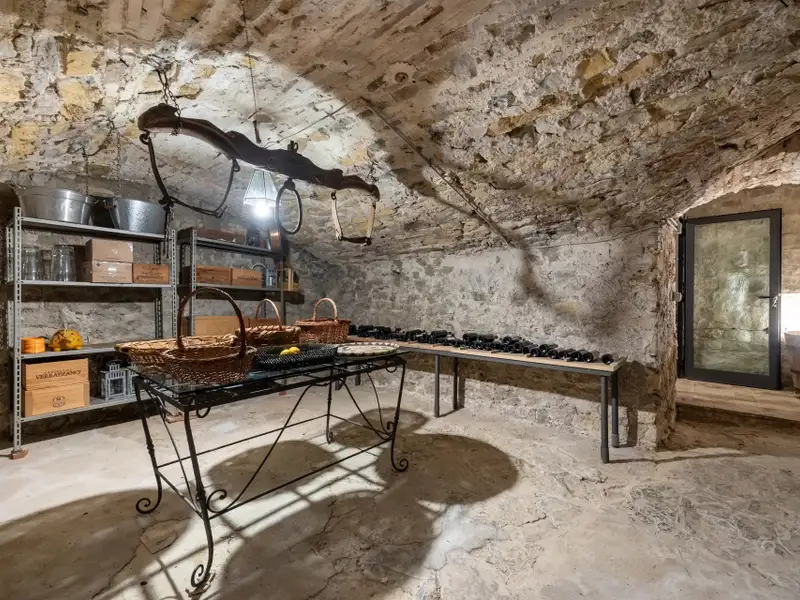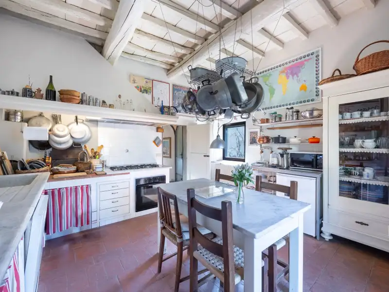 The kitchen is characterized by the beautiful Carrara marble details with which the solid wood countertop was made unique with the sink, cooktop and tabletop. The brick ribbed ceiling characterizes the dining room. Both rooms have direct access to the large outdoor slab with a terracotta floor that extends the living area during summer periods. Adjacent to the dining room is a large room used as a pantry. Also on the same floor a second living room that can be used as a study/bedroom. Two bathrooms. A stone staircase leads down to the charming cellar with brick vaults.