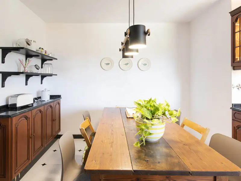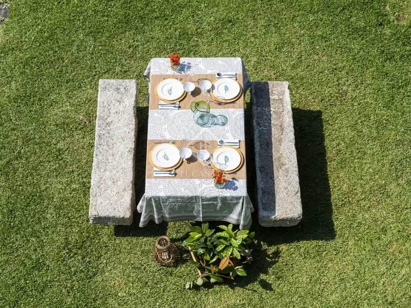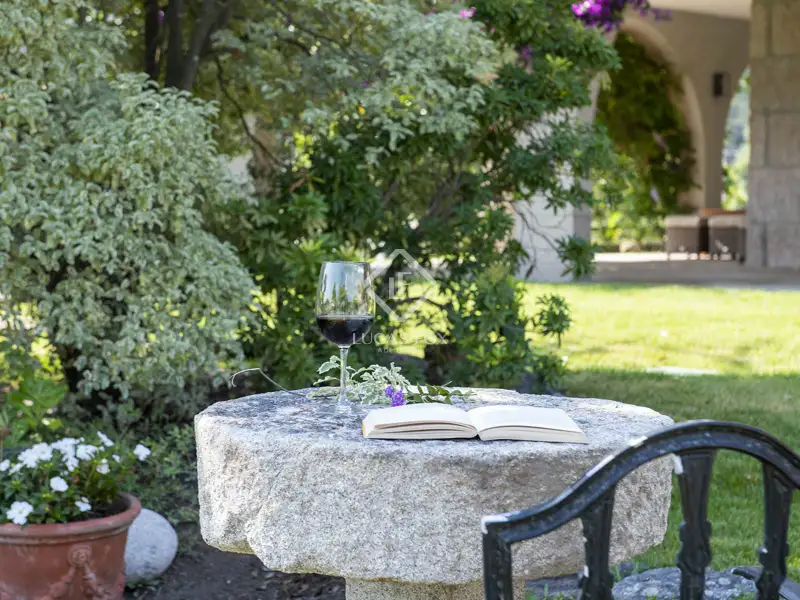 Once outside in the garden area, we have the swimming pool area, offering countryside views. Next to the saltwater swimming pool, we have the summer dining barbecue area. This area is perfect for greeting family and friends and enjoying good times next to the pool and the tennis court on the opposite side. We find the wine cellar underneath the summer dining area.