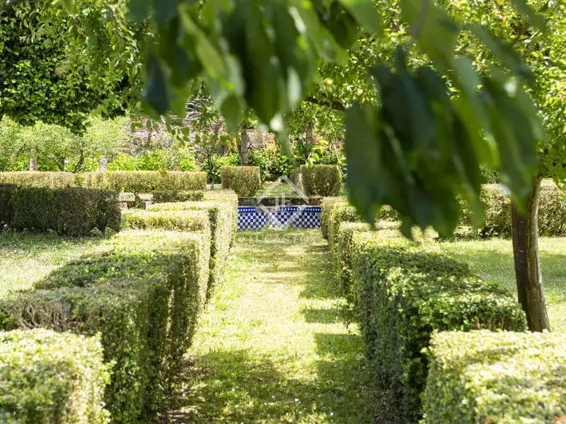 The garden can be accessed from the street through a classical gateway with two fluted columns with Corinthian capitals attached to the wall flanking a semicircular arch supporting an entablature with an ornate frieze. A coat of arms of the Tavares house is displayed there.