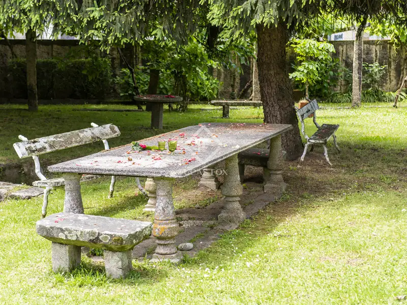 On the rear side of the building, there is an extensive green area in which there was an English and a French garden in the golden days of this Villa Florida, of which there are still signs. It offers large trees, plants, and lovely exterior spaces that can be enjoyed today.