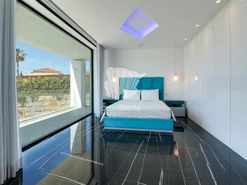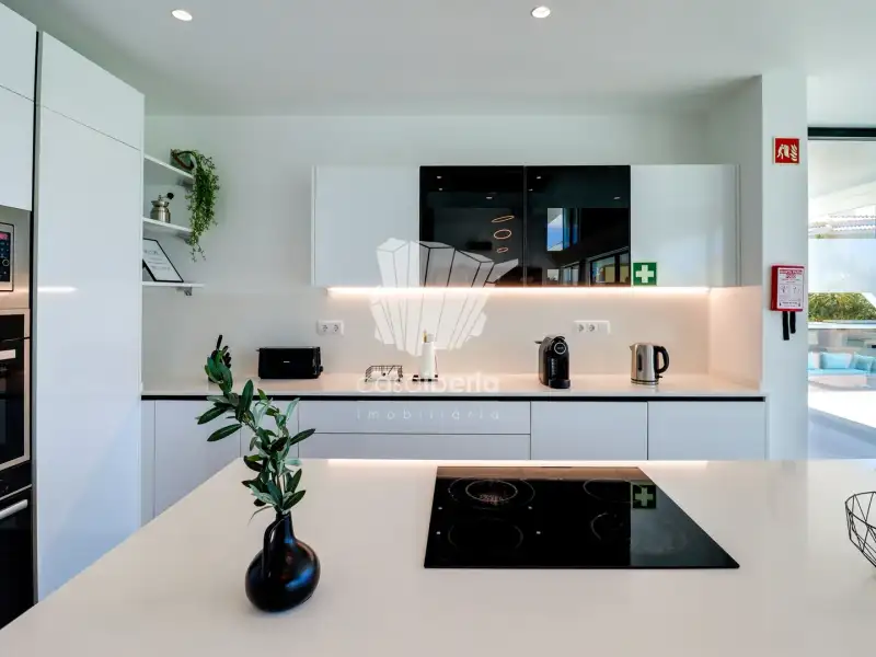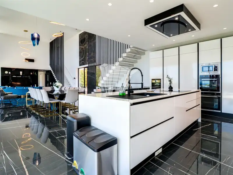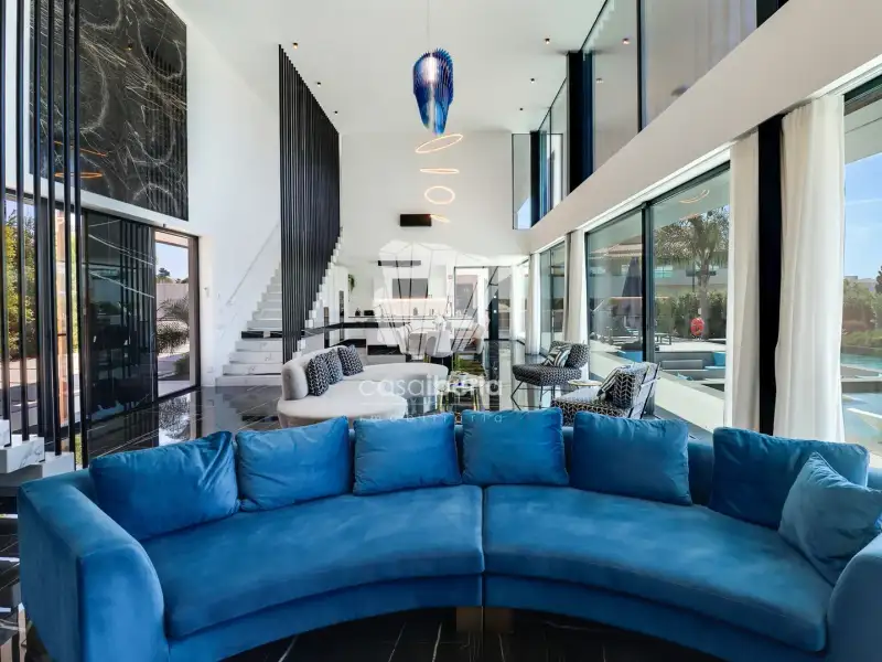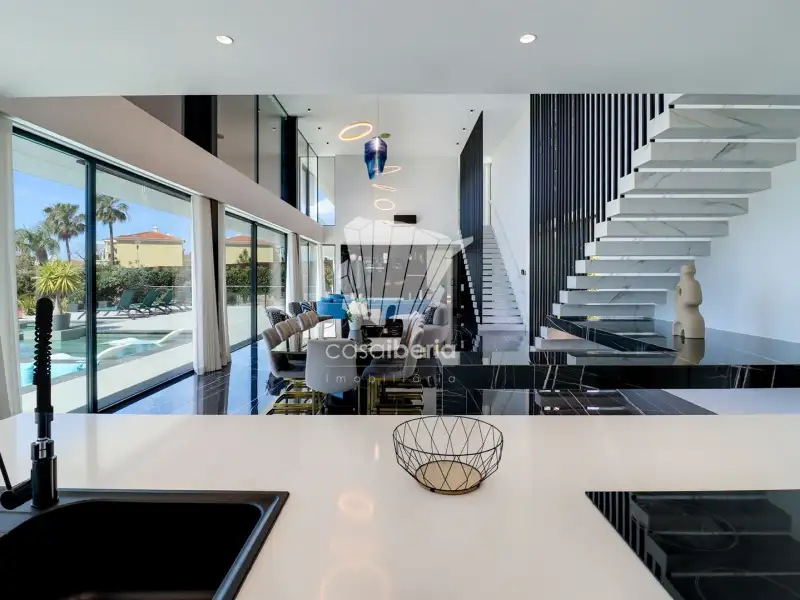 Upon entering, you are greeted by a spacious open plan living and dining room, with an elegant illuminated double staircase. The panoramic views of the sea, the high ceilings that enchant at first glance and the wide sliding glass doors that open onto the magnificent saltwater pool and the outdoor recreation areas create an unparalleled sense of freedom.