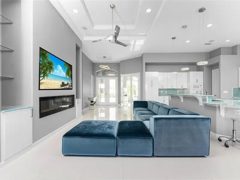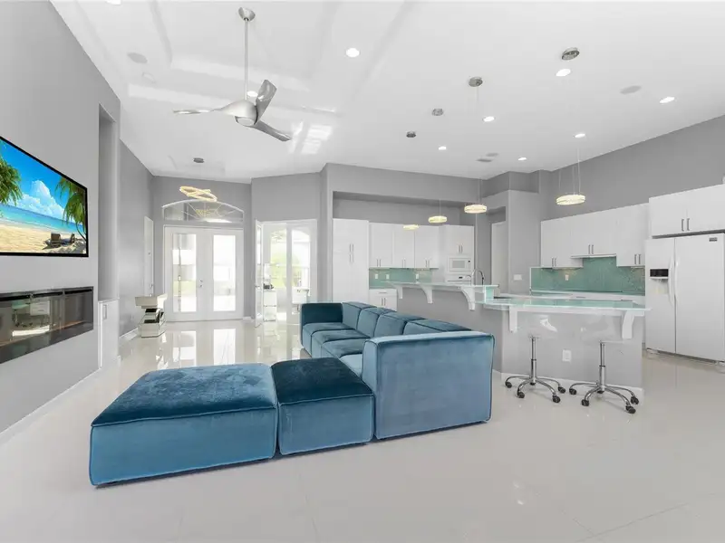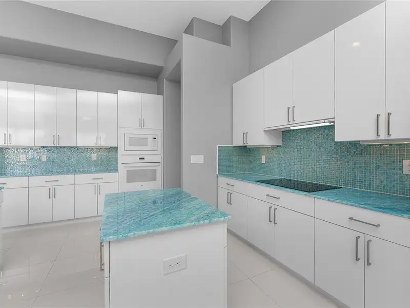 - Gourmet kitchen with aqua onyx countertops