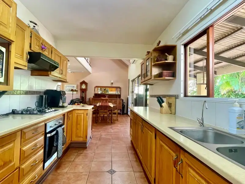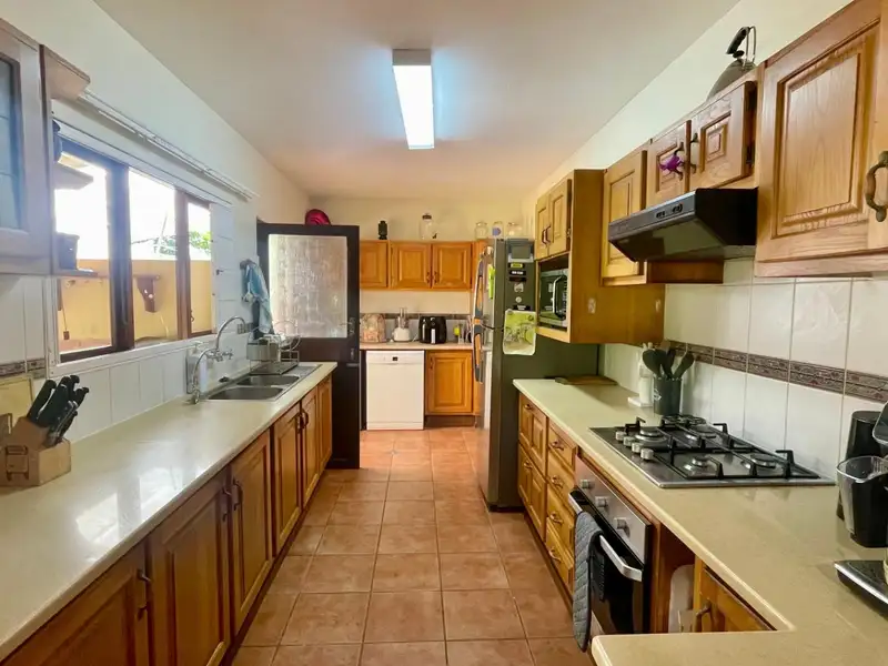 - Spacious gully kitchen with oak cupboards