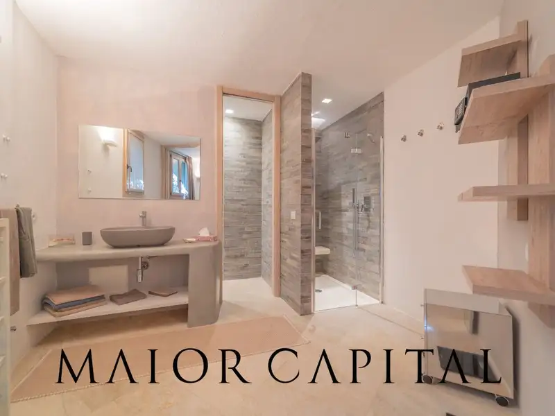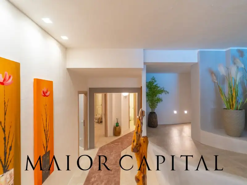 The lower floor, also accessible via an independent entrance, is designed to offer maximum versatility and hospitality. A second spacious living area can be transformed into a private cinema room, ideal for family evenings or entertaining guests in comfort. The sleeping area consists of four bedrooms, each with its own private bathroom, offering high-level accommodation in a private and quiet setting.