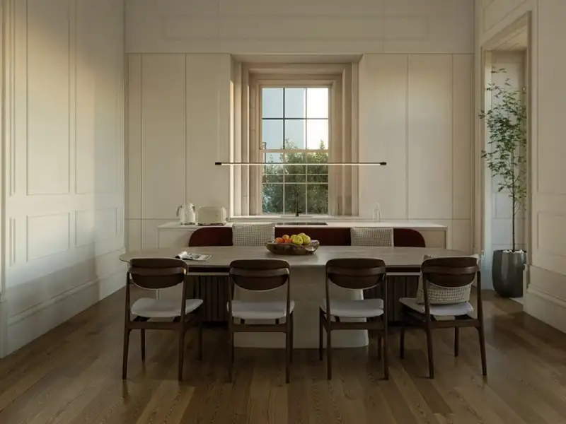 Housed in the Heritage Palace, a completely renovated 18th-century mansion in the heart of the Val D'Ouro Palace private condominium, this three-bedroom apartment with two suites brings together history, comfort and technical excellence in one place. The interior design favors generous ceiling heights in the French ceilings style, which allow natural light to flood in and create an atmosphere of rare surroundings. The social areas appear in a fluid concept, with multi-layered wooden flooring running throughout the spaces and establishing a practical and sophisticated connection between the living room, kitchen and dining area.