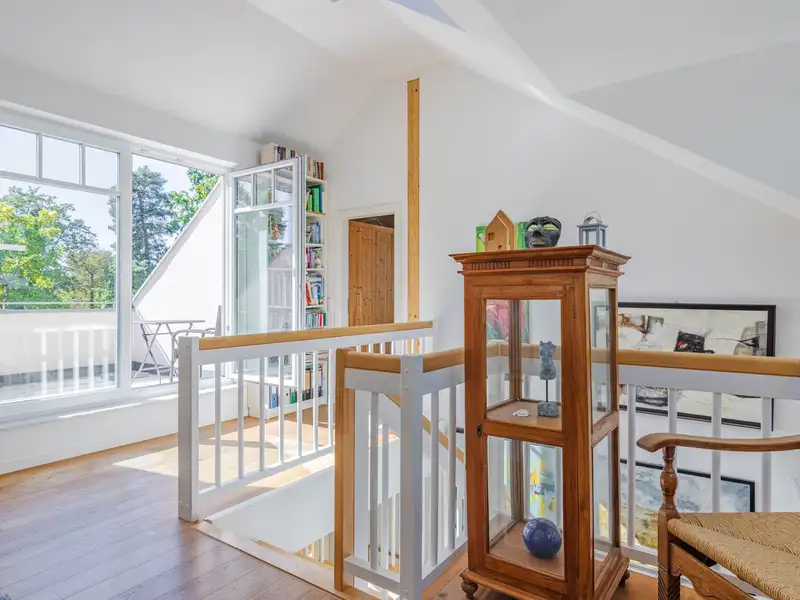 The 6.5 rooms are spread over a total of three levels and allow for individual usage concepts. There are a total of three bedrooms, a small guest room and two bathrooms. The fully developed top floor offers further scope for the ideas of a future user. This area is currently designed as an open studio. In addition to two storage rooms, there is a sauna area with shower and access to the interior roof terrace.