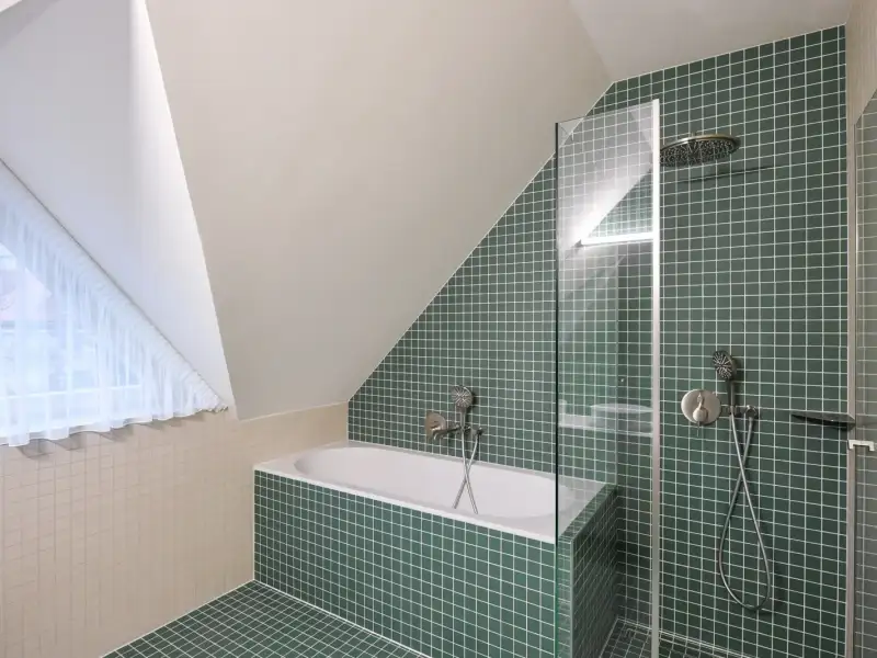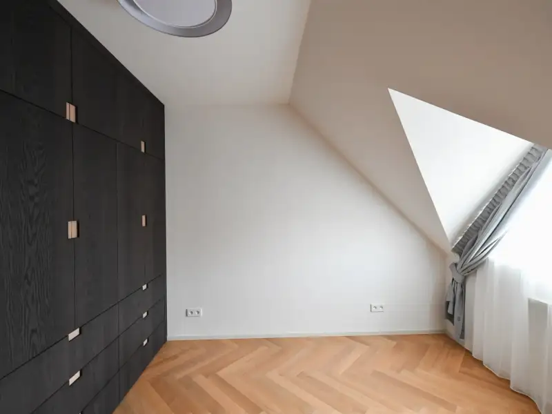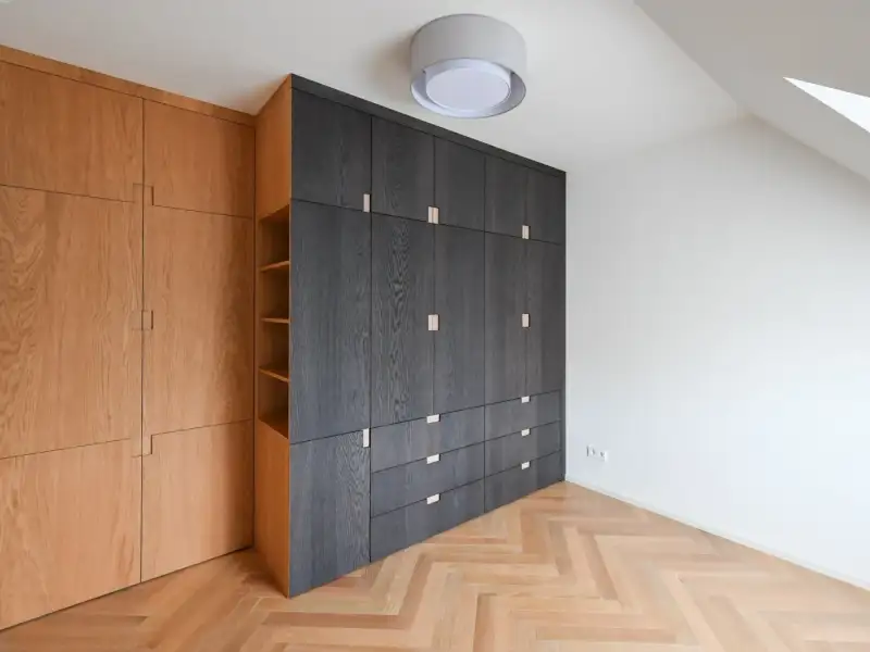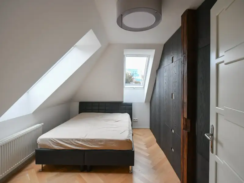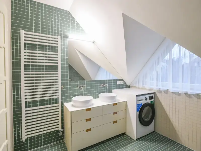 Comfort is also enhanced by the clean design of the bathroom, featuring underfloor heating, high-quality sanitary facilities, and a combined Bosch appliance (washer with dryer). The entire interior respects the house's history, relying on precise craftsmanship and natural materials. The house is situated in the heritage zone of Prague's Vinohrady and is part of a villa colony founded in 1912 by the Building Association of Prague Journalists and Writers.
