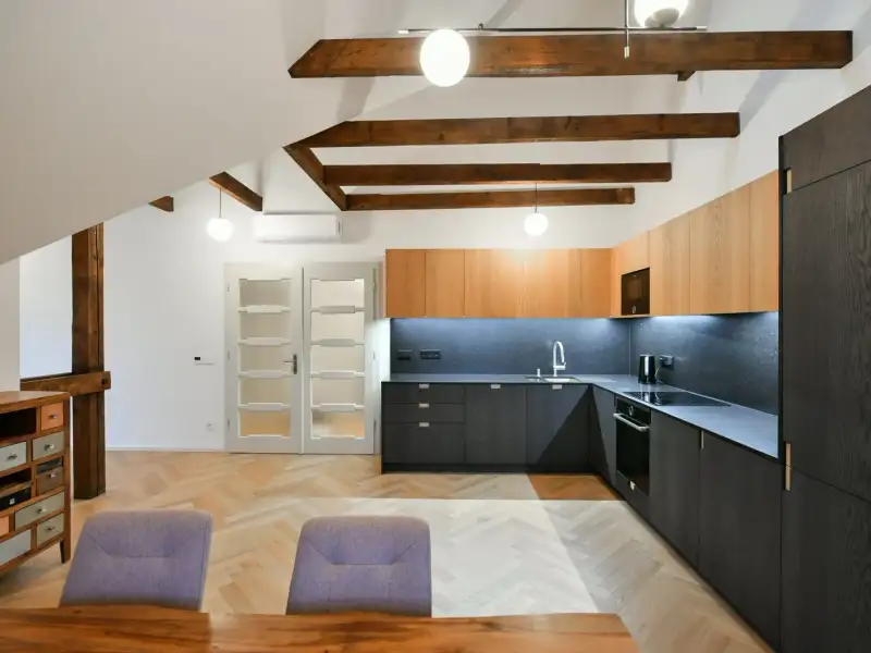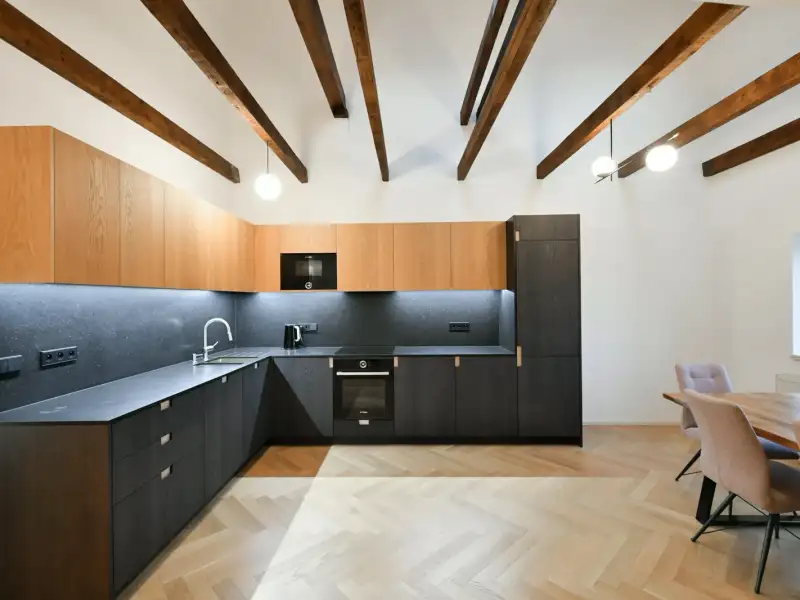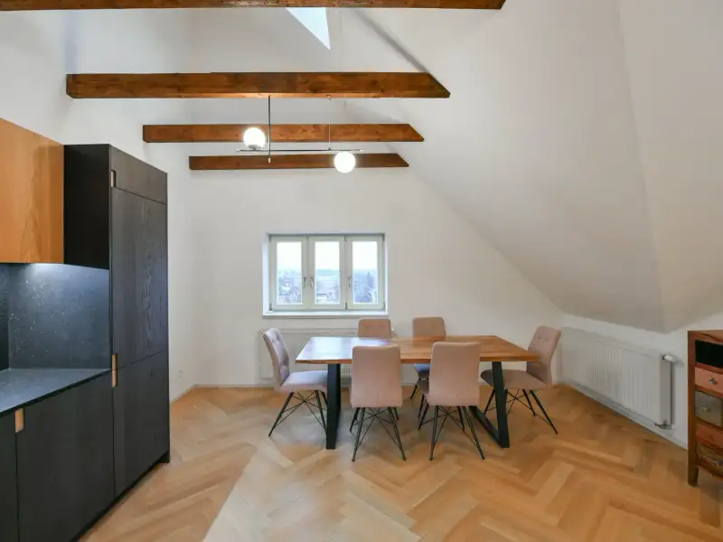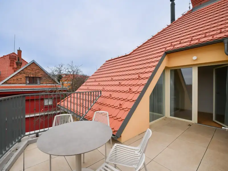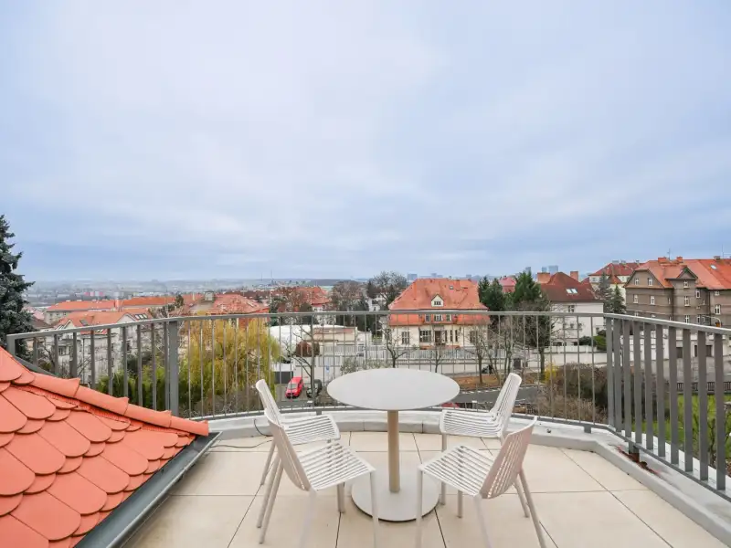 The listed rental property offers an apartment on the top 3rd floor with a 3+kk layout and a floor area of 100 m2 with a terrace and private parking space in the underground garage, which is connected by elevator to the garden. This is the first rental after a reconstruction completed in 2025. The apartment will be available from March 1, 2026, and is intended for long-term rental.