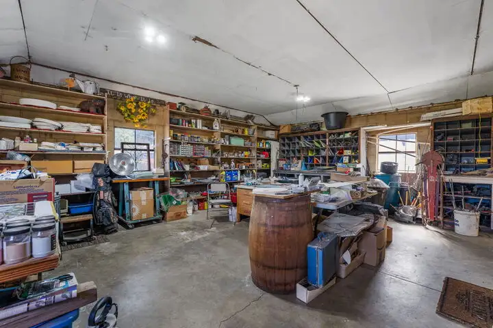 - Detached two-car garage with workshop space