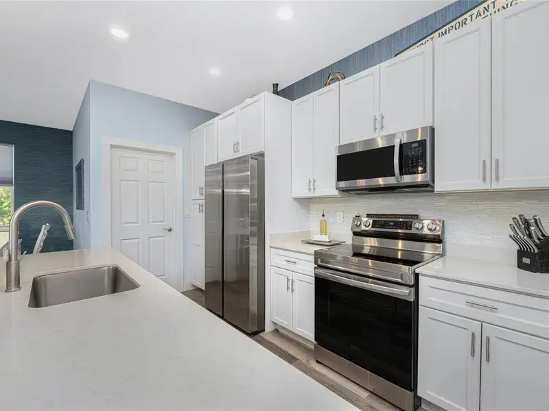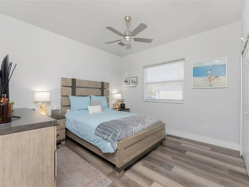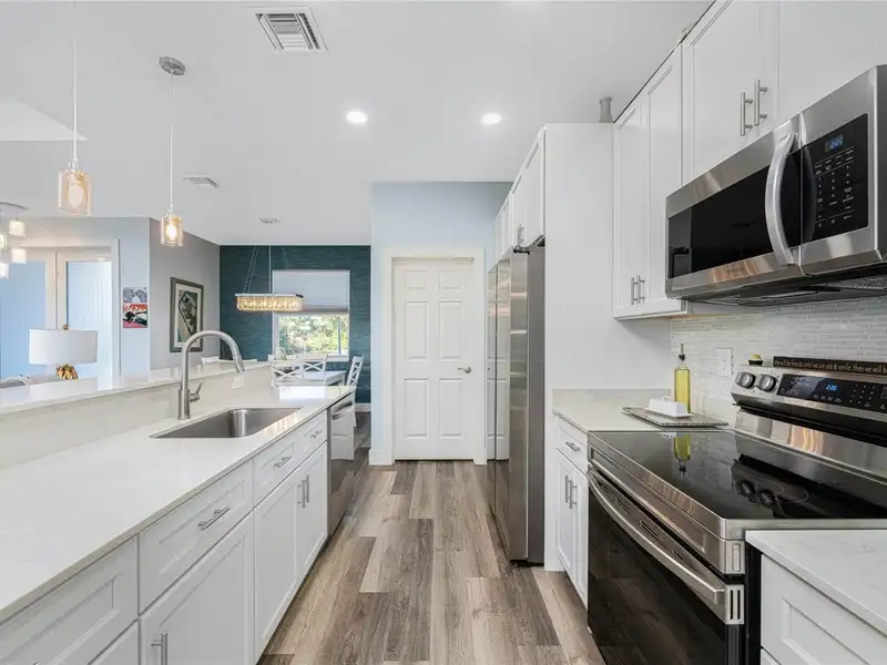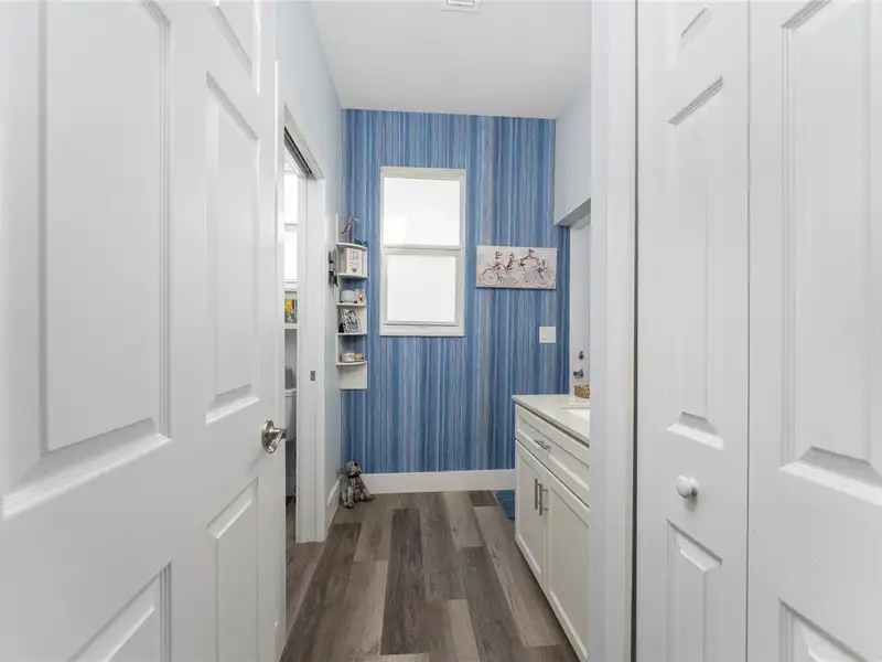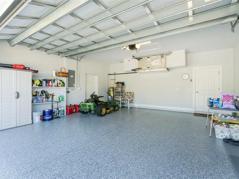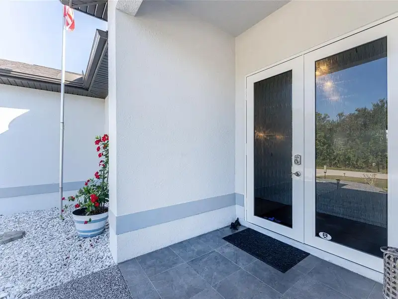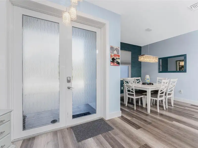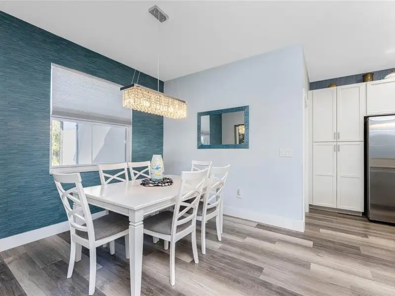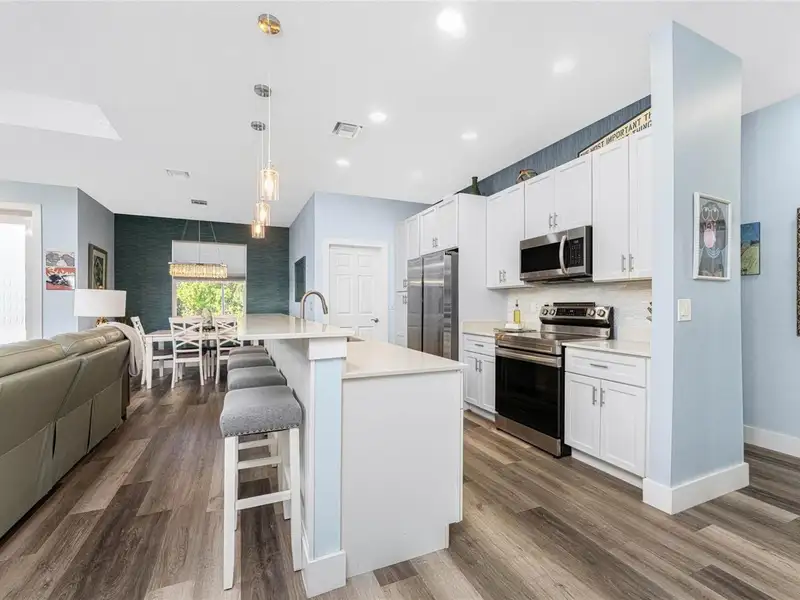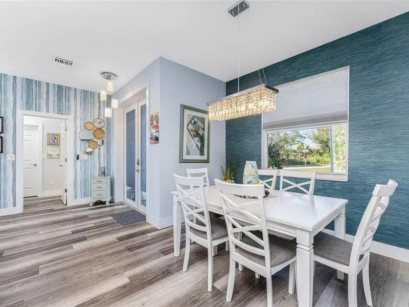 The open-concept floor plan with 9-foot ceilings provides an expansive feel and plenty of natural light, creating a welcoming atmosphere. The great room and all bedrooms have ceiling fans installed, there’s gorgeous custom lighting in the foyer, dining room, and kitchen. Show stopping designer accent walls are in the great room and dining room. Scratch- and water-resistant vinyl flooring throughout the home provides a seamless and low-maintenance look. Impact windows and doors, a water softener, in-ground termite protection, and an epoxy garage floor with a lifetime warranty will give you peace of mind and protection. Additionally, the X flood zone location provides savings on insurance.