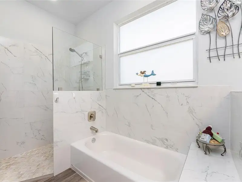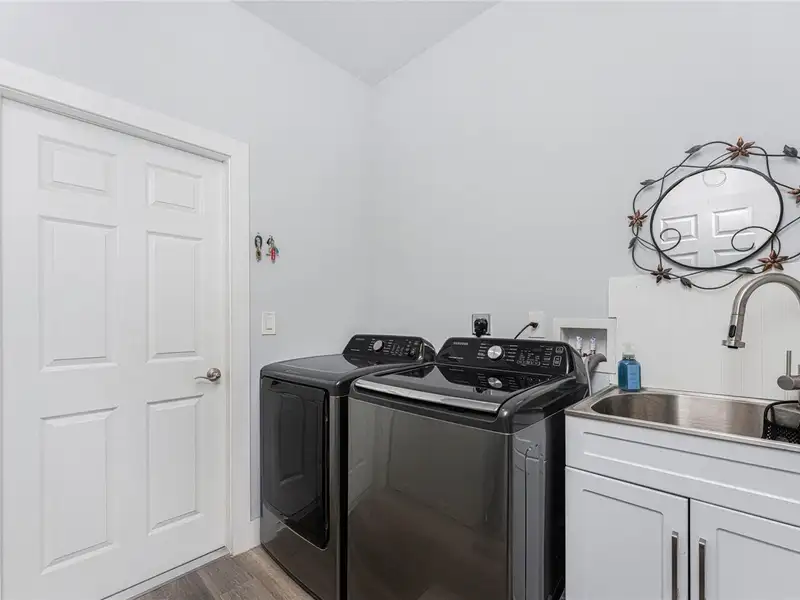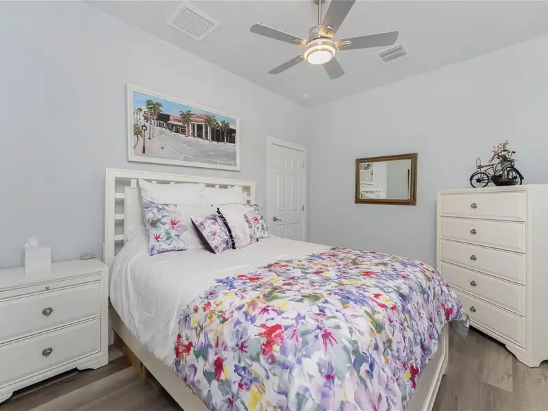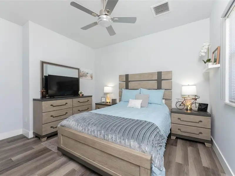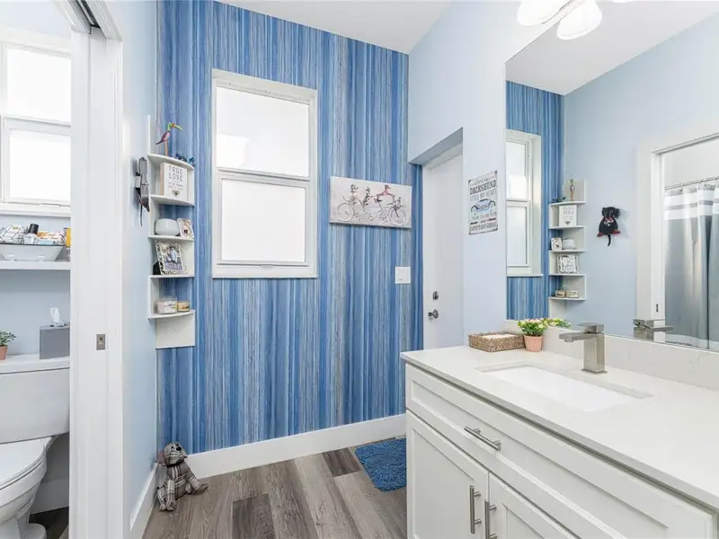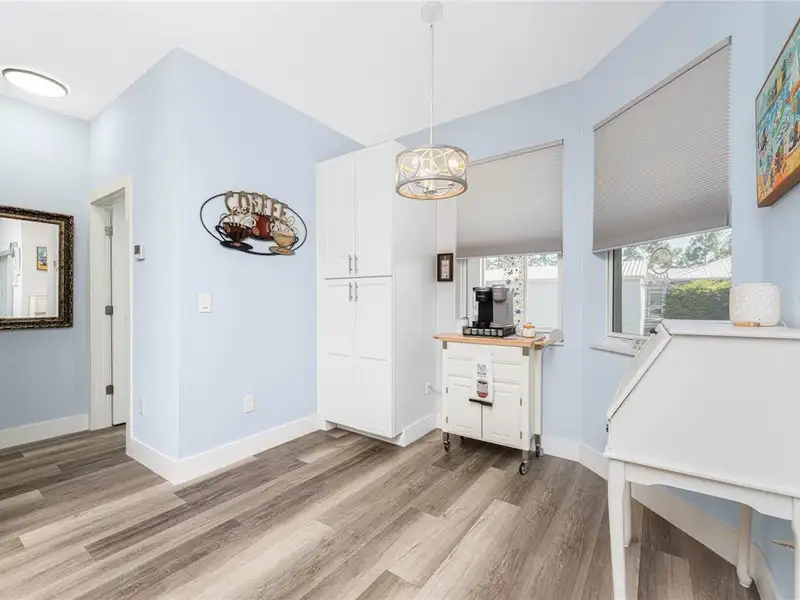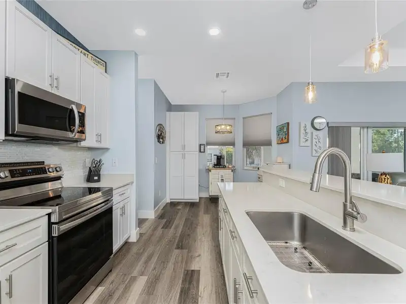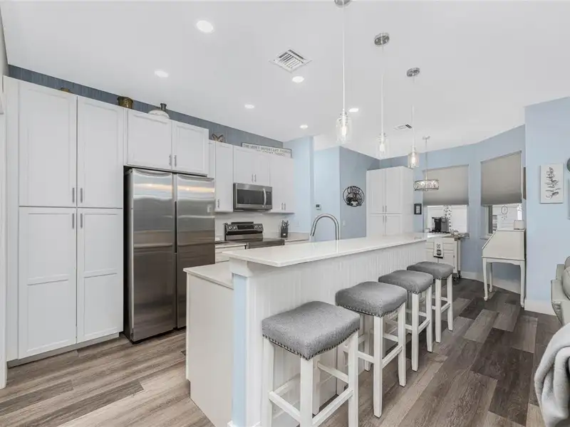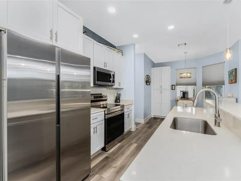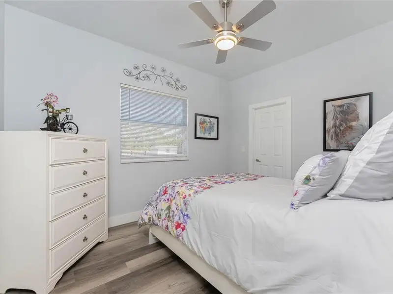 The open-concept floor plan with 9-foot ceilings provides an expansive feel and plenty of natural light, creating a welcoming atmosphere. The great room and all bedrooms have ceiling fans installed, there’s gorgeous custom lighting in the foyer, dining room, and kitchen. Show stopping designer accent walls are in the great room and dining room. Scratch- and water-resistant vinyl flooring throughout the home provides a seamless and low-maintenance look. Impact windows and doors, a water softener, in-ground termite protection, and an epoxy garage floor with a lifetime warranty will give you peace of mind and protection. Additionally, the X flood zone location provides savings on insurance.