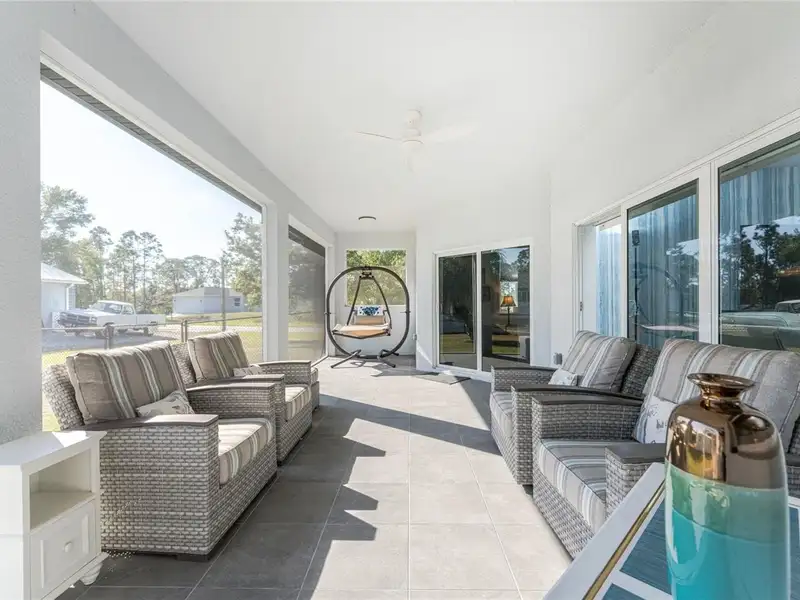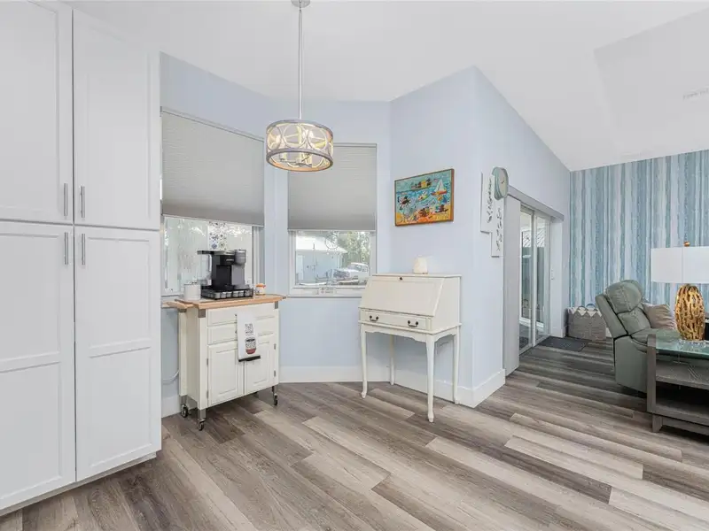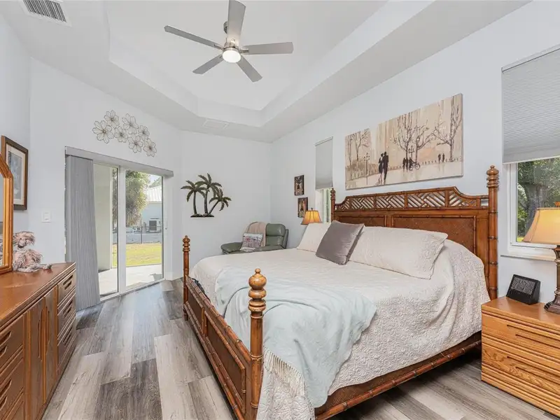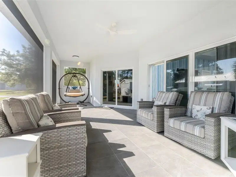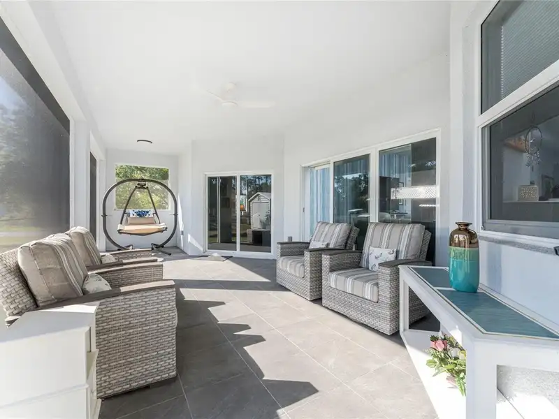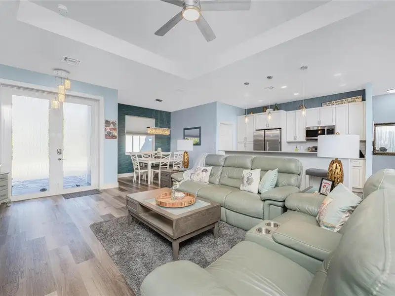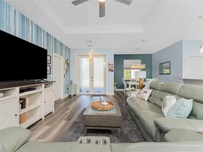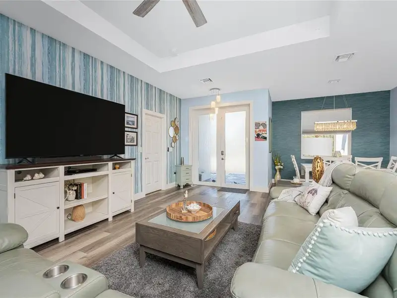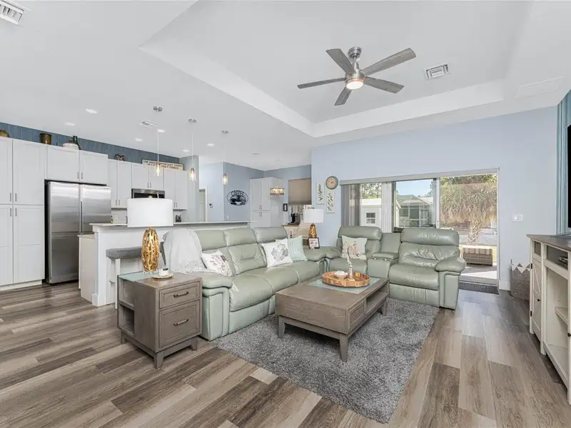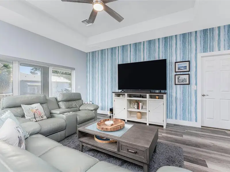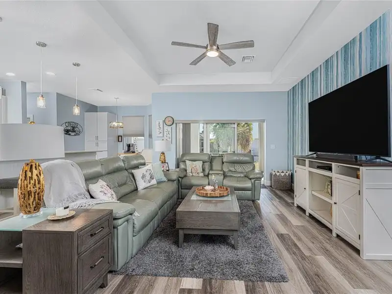 The spacious great room features a tray ceiling, designer accent wall, and a slider that opens to the screened lanai—perfect for enjoying Florida's coastal lifestyle. Just imagine the coastal breezes you'll enjoy while friends in the north are freezing.