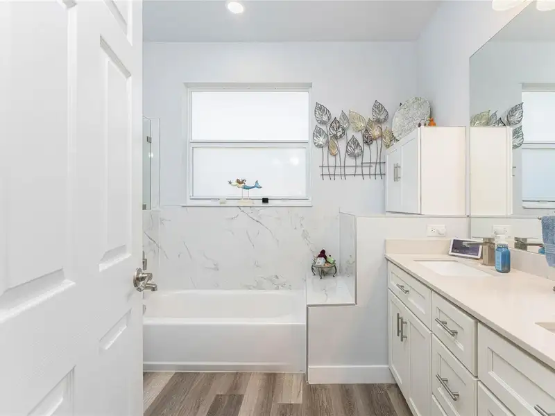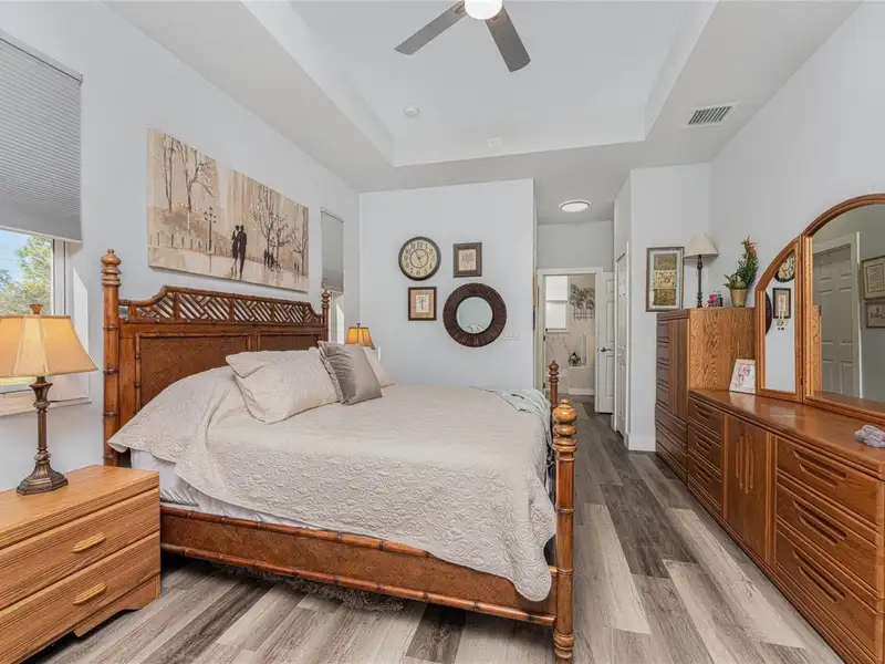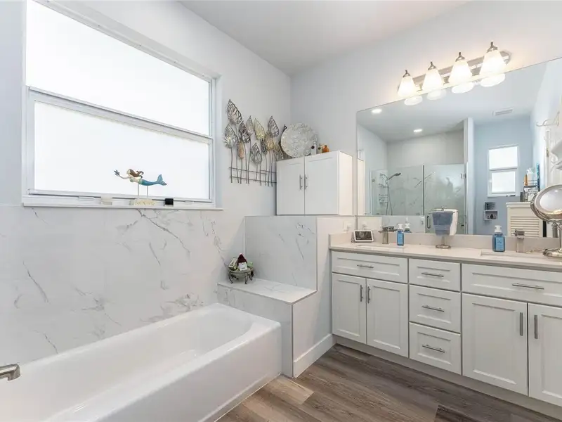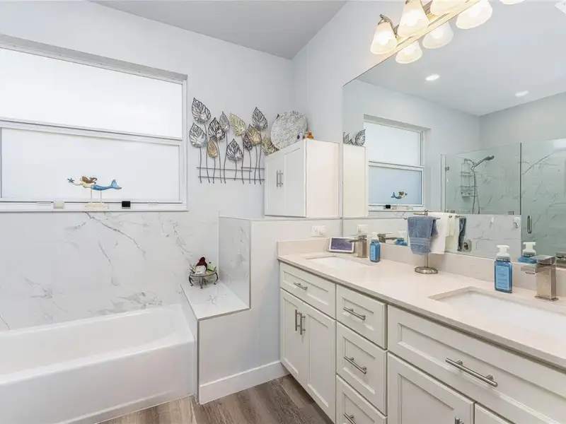 The primary suite features access to the lanai, dual closets, an en suite with dual vanities, a walk-in shower, and soaking tub. The two additional bedrooms share a guest bath with the vanity separated from the tub/shower combo and water closet by a pocket door — meaning two people can get ready at once! The guest bath also has an exterior door direct to the lanai for a future pool (there is room for a pool in the backyard).