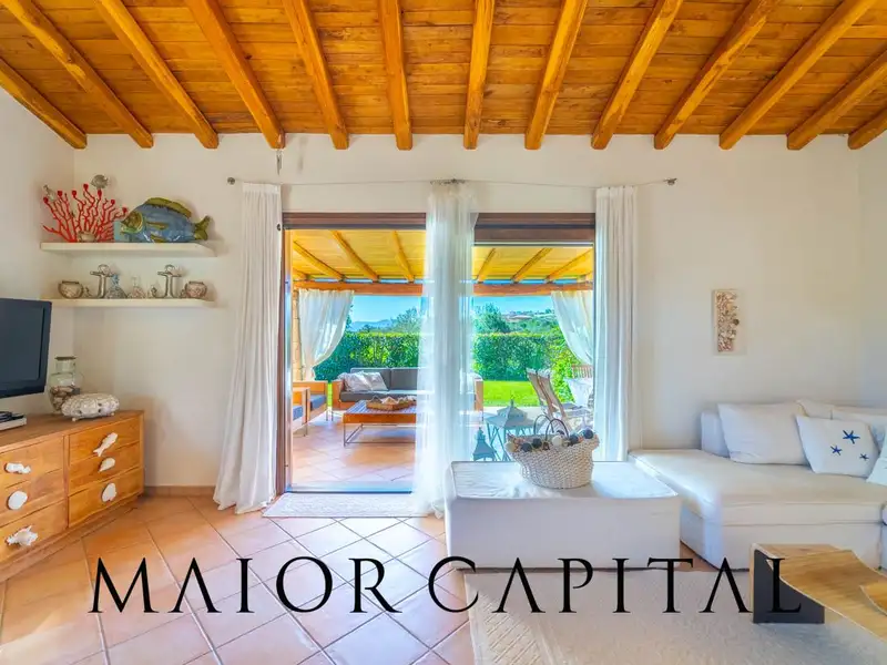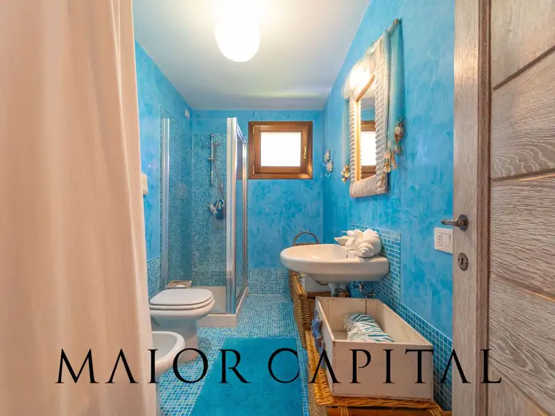 At the entrance, a spacious covered veranda invites you to relax outdoors, providing the ideal place to enjoy sunny days and summer evenings with a unique view of the garden and the sea. Inside, the living area features a spacious living room with a fully equipped kitchen, bright and airy, perfect for entertaining guests or relaxing with the family.