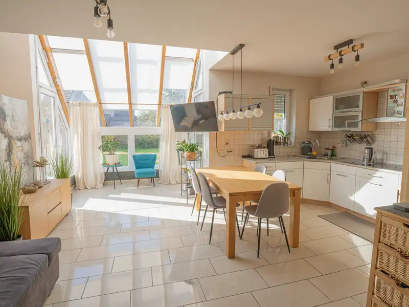 The bright and inviting entrance area leads you into a well thought-out room concept that sensibly combines functionality and living quality. On the first floor, you are greeted by a spacious living room that offers a variety of options for cozy living and family areas. The well-kept kitchen is extended by a light-flooded conservatory, which stylishly complements the dining area and offers a beautiful view of the garden with its large windows. You can also access the terrace directly from here. Next to the kitchen is a practical utility room, which also provides access to the garage and ensures short distances in everyday life. The first floor is rounded off by a daylight bathroom, a bedroom and a separate office.