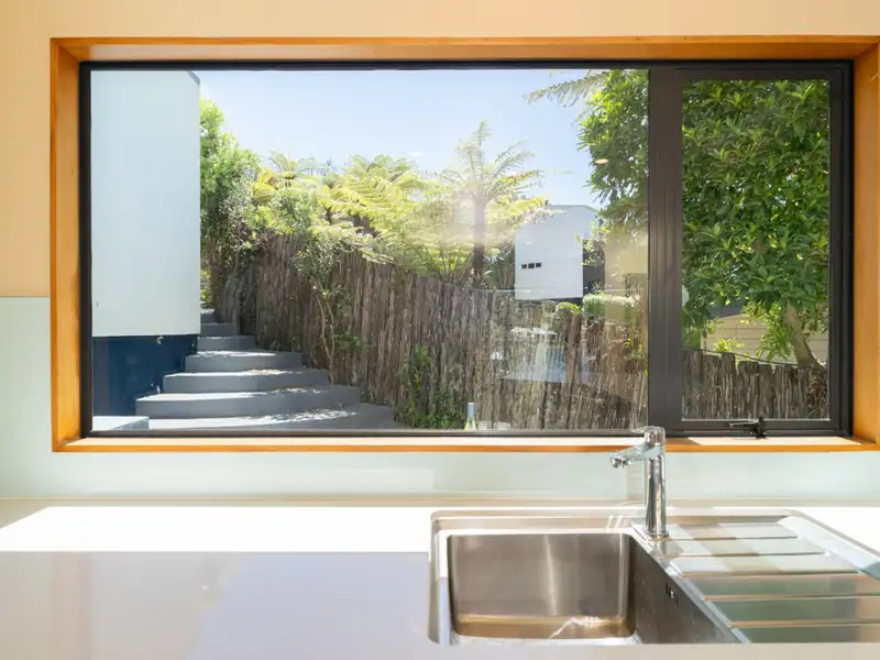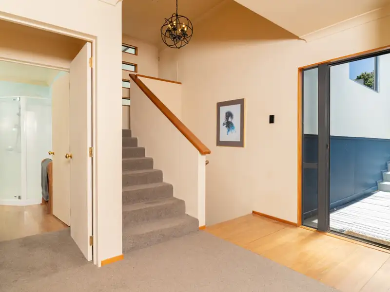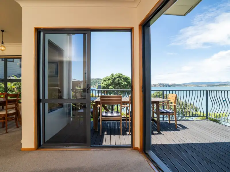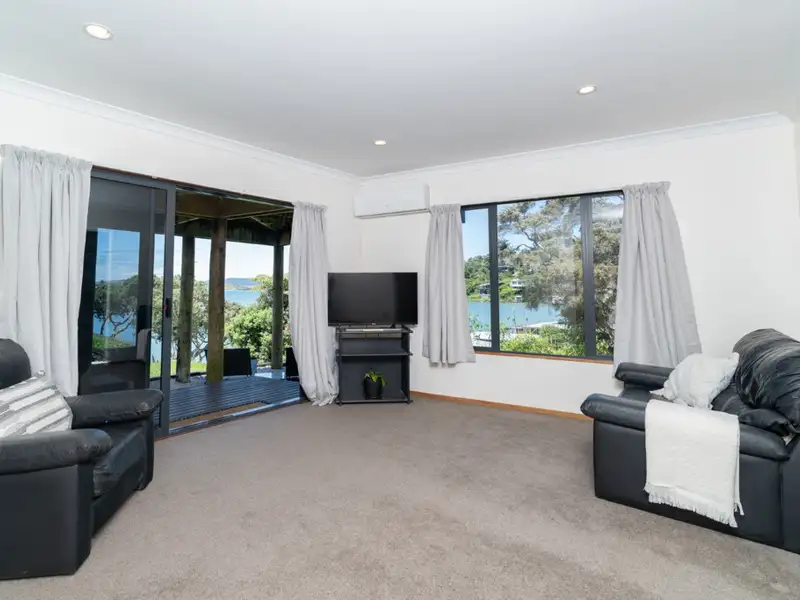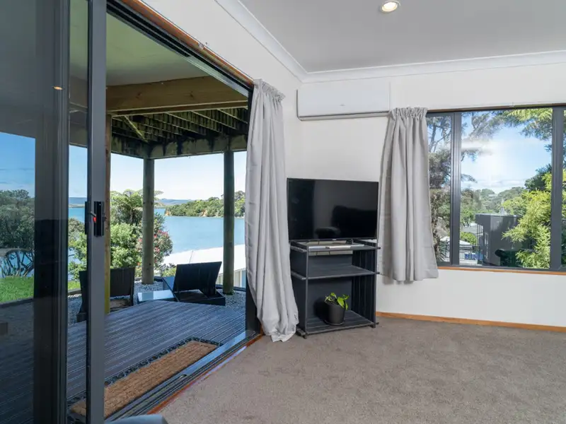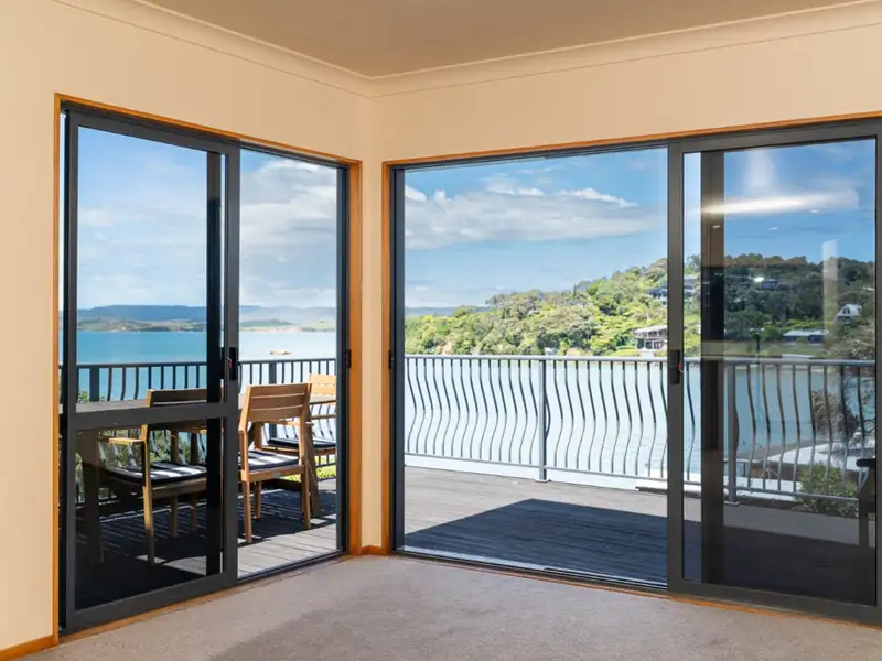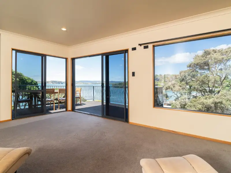 At the heart of the home is an open-plan living area that's ideal for entertaining. The space flows seamlessly onto a generous sun-soaked deck, where panoramic views of the bay provide an ever-changing natural backdrop perfect for hosting or simply unwinding with a glass in hand.