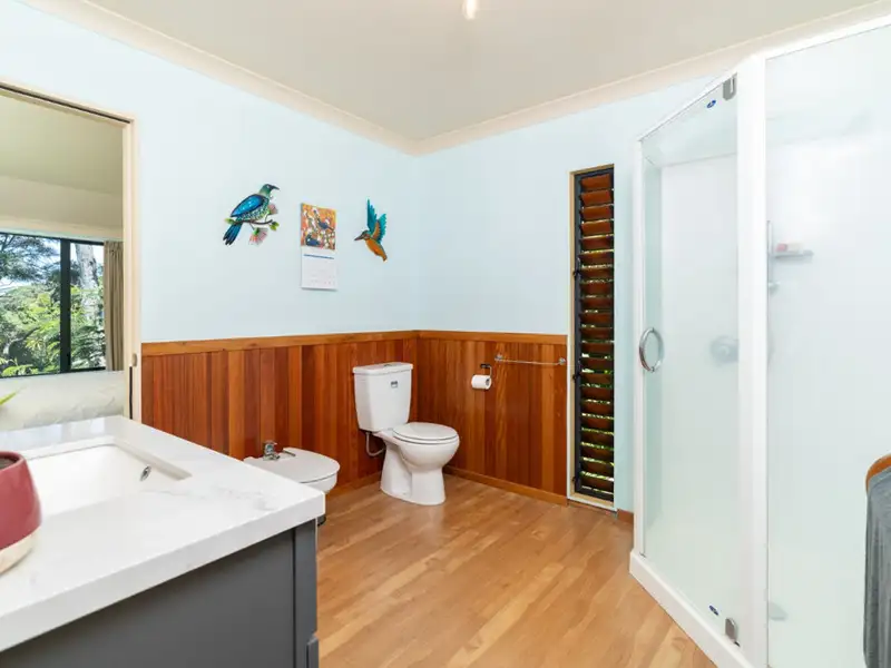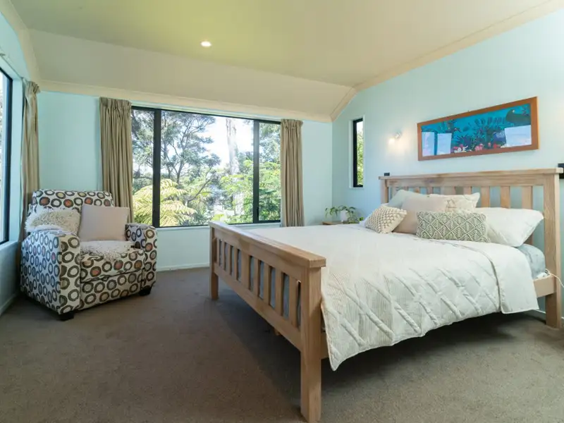 The kitchen is a standout modern, practical and positioned to keep you connected to your guests. Whether you're cooking for two or a crowd, this is a space that inspires. The master suite, tucked quietly upstairs, it feels like a private sanctuary. Large windows frame the tranquil bush and bay outlook, while soft natural light fills the room. It's a retreat you'll never want to leave. A spacious, well-appointed bathroom is conveniently located nearby.