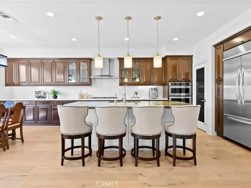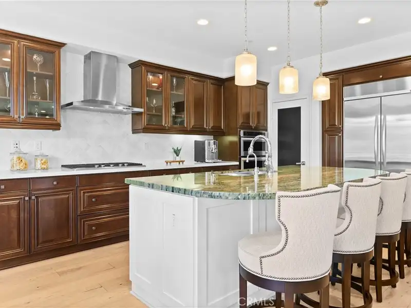 - Chef’s kitchen with Caesarstone counters and built-in fridge