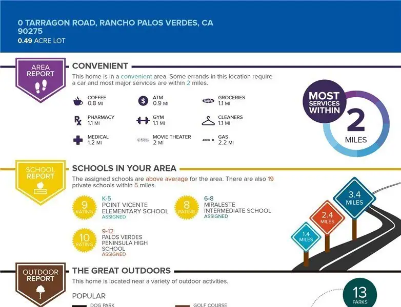 Get away from it all and enjoy a secluded, less-congested part of the Palos Verdes Peninsula with your dream ocean view home at the end of a cul de sac on Tarragon Road! You will be close to nature right in your backyard, with direct access to some of the best hiking areas on the hill. The Three Sisters Reserve opens up beyond your rear property line, giving you a gateway to SoCal’s natural landscape and wildlife from the privacy of your own property. Just shy of a half acre with an unbeatable ocean view, this is one of the last vacant buildable lots in Rancho Palos Verdes. A harbor or Orange County view is nice - but an unobstructed panorama of Santa Catalina Island and the Channel is so much better, and on clear days you can even see Santa Barbara Island! It is quiet and peaceful here, far enough from the drive to limit road-noise and more stars in the night sky without city lights to drown them out. You can hear sea lions near Terranea calling to each other on a summer evening and enjoy the winter whale migration from the tranquility of your own retreat. The Mediterranean climate is ideal at Abalone Cove. When it is cold or hot elsewhere on the Peninsula, it is more temperate here. Located near beach access, shopping, fine dining, world-class golf courses and award-winning Palos Verdes Unified schools. This is your opportunity to snatch up a blank canvas and realize your dreams of peace and calm within the hustle and bustle of LA County. Soils Report available upon request. Seller also has fire department approved/stamped architecturals for water and (fire truck) access, as well as fire flow testing from water purveyor, and soil testing on existing shared driveway to meet the fire department’s All Weather Access Requirements. Documents to be made available to Buyer with an acceptable offer. Lot lines in photos are for illustrative purposes only and not to be relied upon.