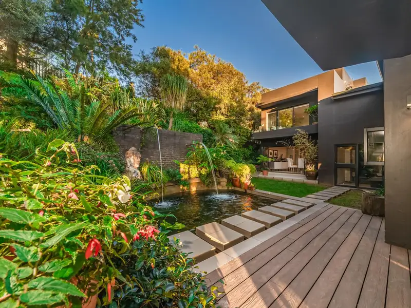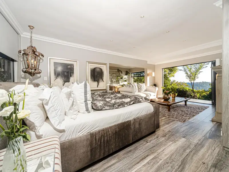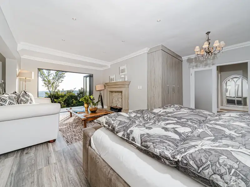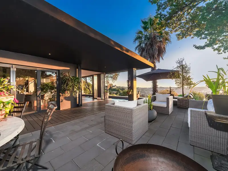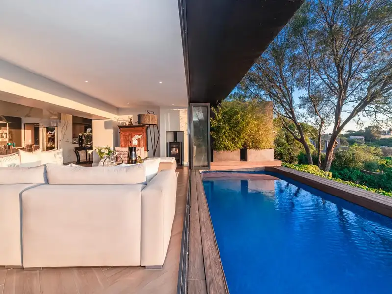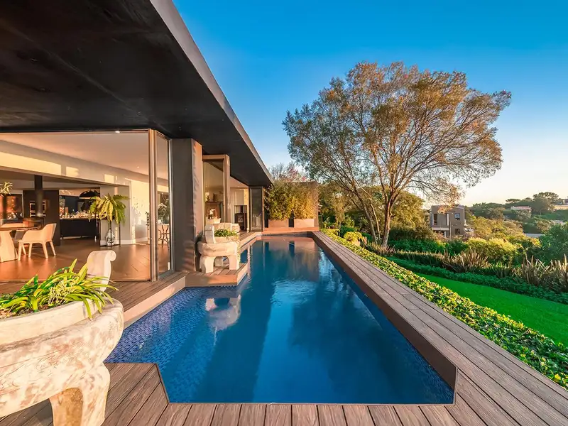 Stepping through the grand glass doors, youΓÇÖre welcomed by a light-filled, open-plan interior where spaces flow effortlessly. A striking double-sided fireplace anchors the lounge and dining room, casting warmth across the elegant wood-look flooring. Floor-to-ceiling stacker doors peel away to reveal a private timber deck and a heated mosaic swimming poolΓÇöperfect for soaking up the sun or enjoying twilight views of JohannesburgΓÇÖs skyline.