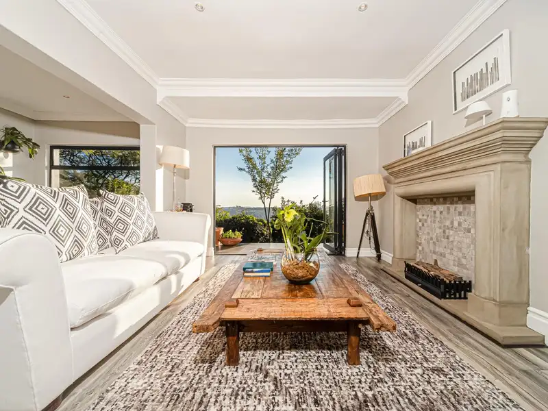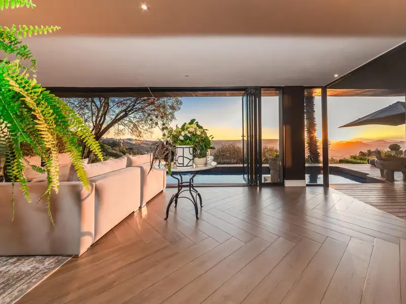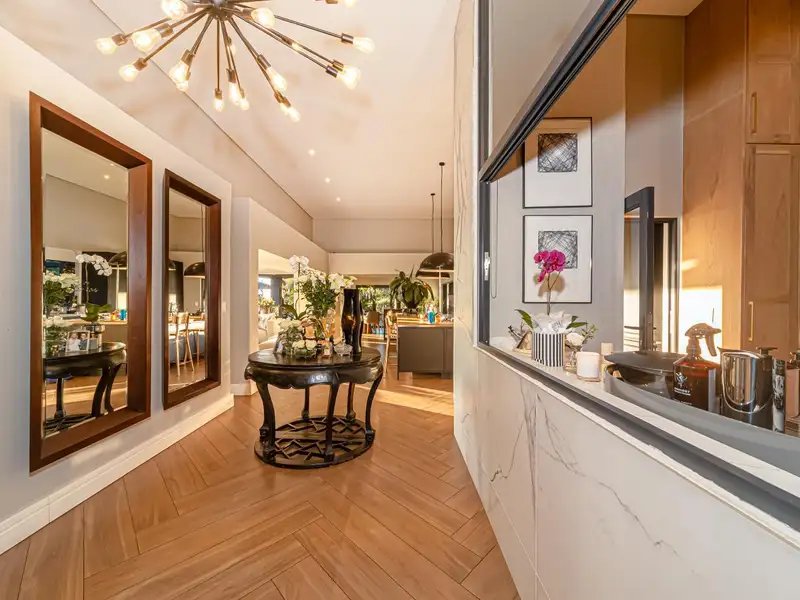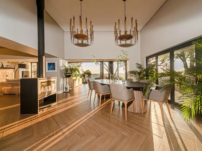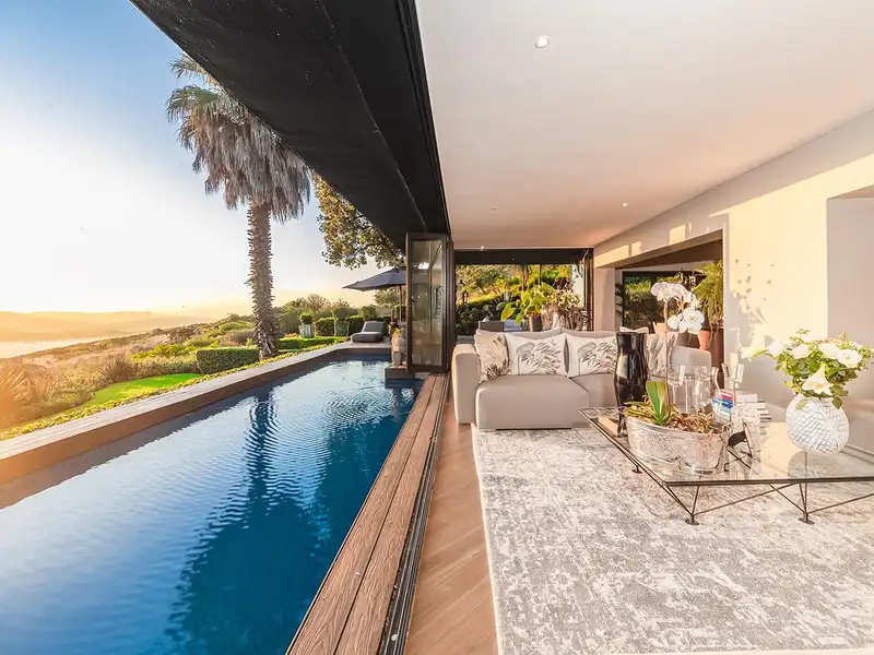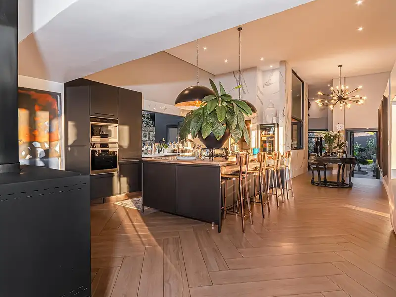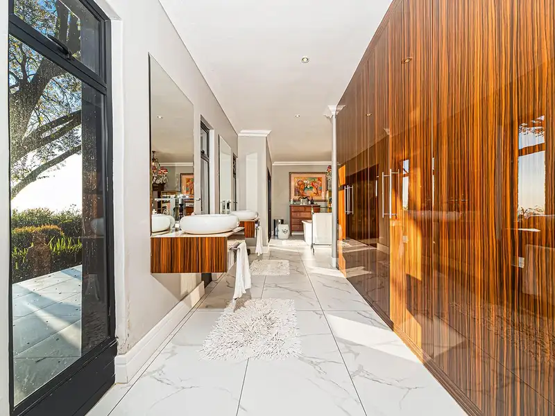Stepping through the grand glass doors, youΓÇÖre welcomed by a light-filled, open-plan interior where spaces flow effortlessly. A striking double-sided fireplace anchors the lounge and dining room, casting warmth across the elegant wood-look flooring. Floor-to-ceiling stacker doors peel away to reveal a private timber deck and a heated mosaic swimming poolΓÇöperfect for soaking up the sun or enjoying twilight views of JohannesburgΓÇÖs skyline.