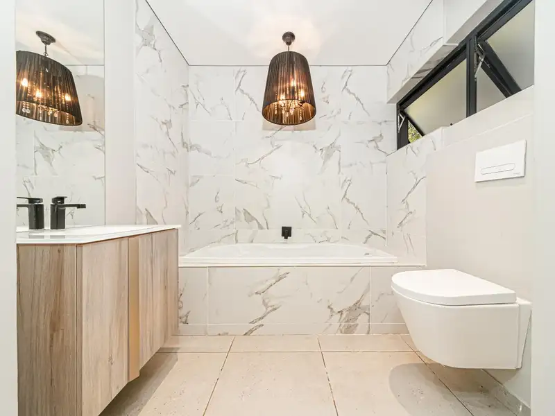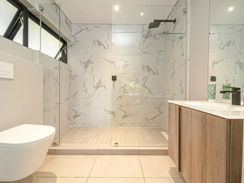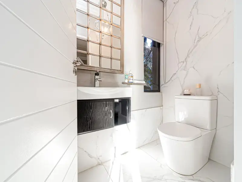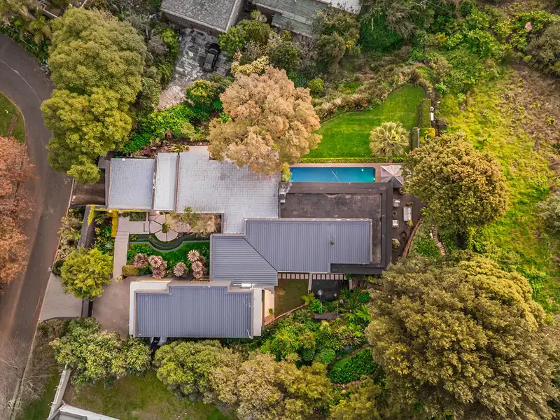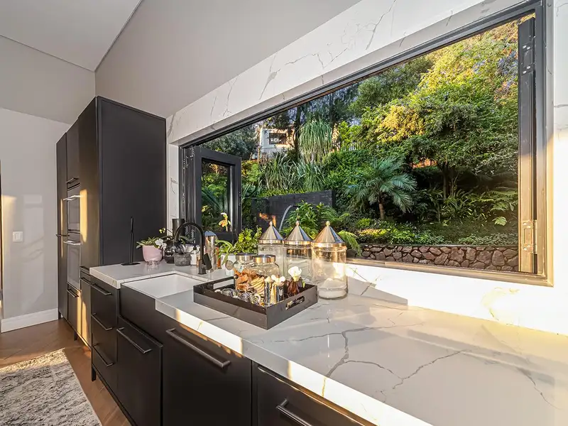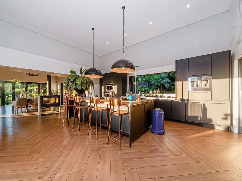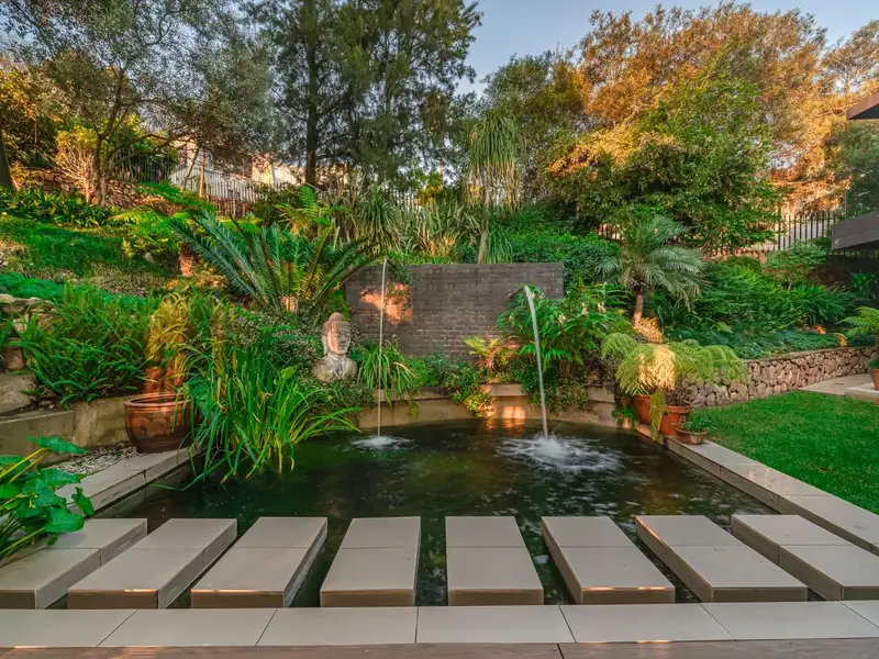 The right wing reveals even more to love: a secondary open-plan kitchen and lounge area opens into the garden and wraps around the koi pondΓÇöideal for guests or dual living. Upstairs, two additional bedrooms each feature their own en-suite bathrooms and private balconies that overlook the manicured garden and surrounding landscape.