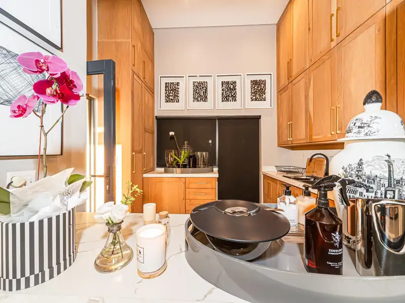 The dining area, framed by lush greenery and wide vistas, spills into a gourmet kitchen designed for both function and flair. Here, no detail has been spared: a double Whirlpool oven, gas hob, built-in fridge, microwave, dishwasher, coffee machine, and a wine cooler create a seamless culinary experience. Tucked just behind is a generous scullery adorned with bespoke cabinetry and stone countertops, keeping everything crisp and clutter-free.